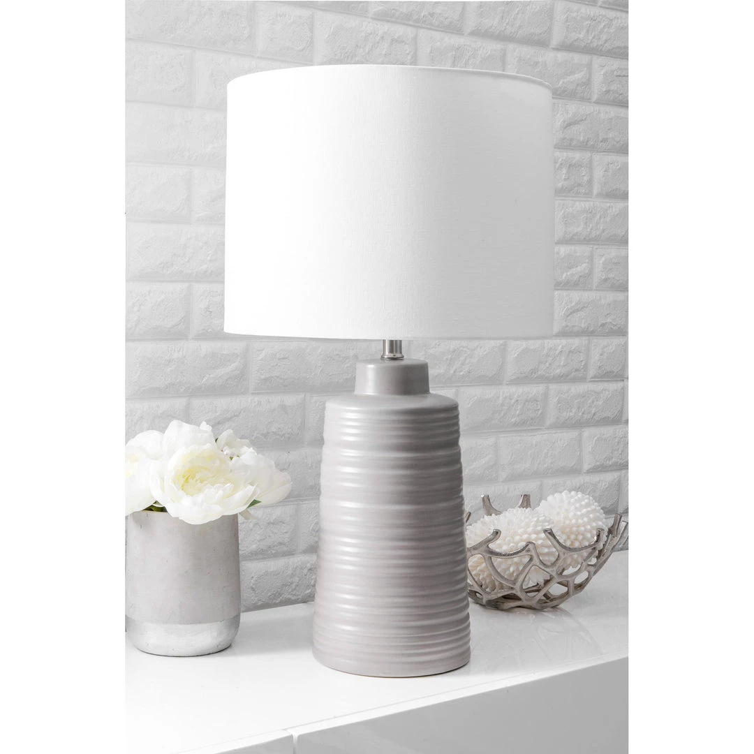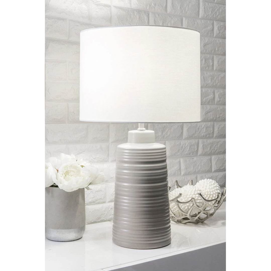 Let your room shine with the addition of this lavish 27-inch abstract table lamp. It has a Linen Drum shade that delivers bright ambient lighting. Adds a vibrant flair to any room with its gray ceramic finish. It has a 15-inch wide, ivory linen, drum lampshade that delivers soft lighting.
