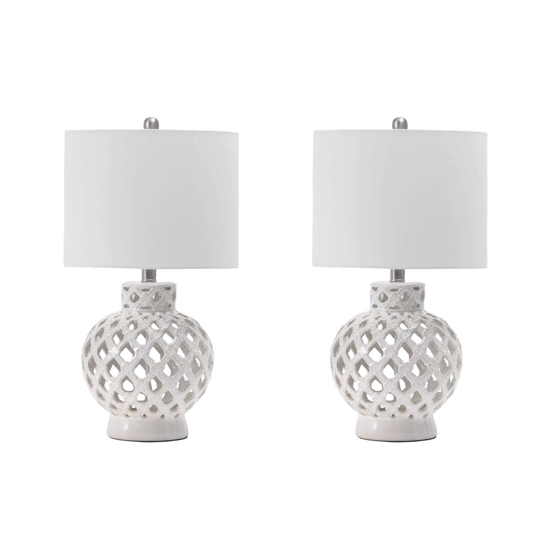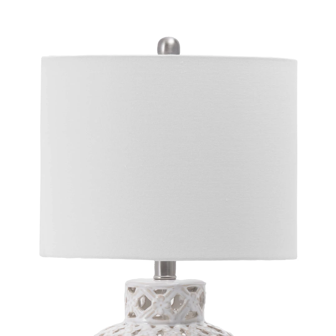 Calm the vibe in your coastal-designed living space with this decorative table lamp. The wide, rounded body features classic ceramic construction with textured designs for a sense of depth. The fabric shade diffuses light well, giving you functional, warm illumination, and the simple on-off switch makes operation easy.
