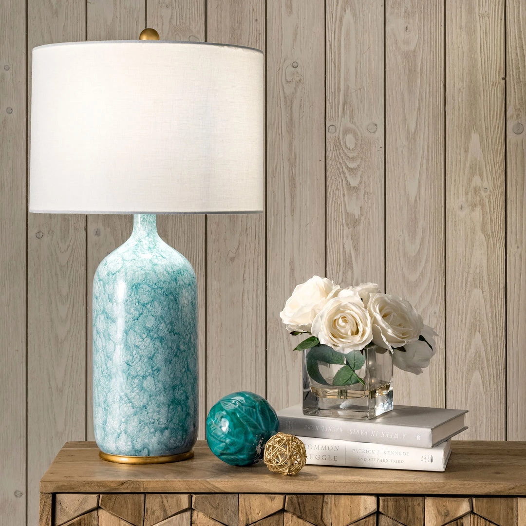 Keep your space looking bright with the Ashton contemporary blue table lamp from nuLOOM. A fashionable piece, which is perfect for showing off your glamorous taste, this table lamp gives off an air of sophistication with a marble-patterned base and white drum-shaped shade. Whether you place this lamp atop a console table along your hallway, or set on a side table by the sofa, this lamp adds flair and a cool tone to your decor with its soft bluish color.