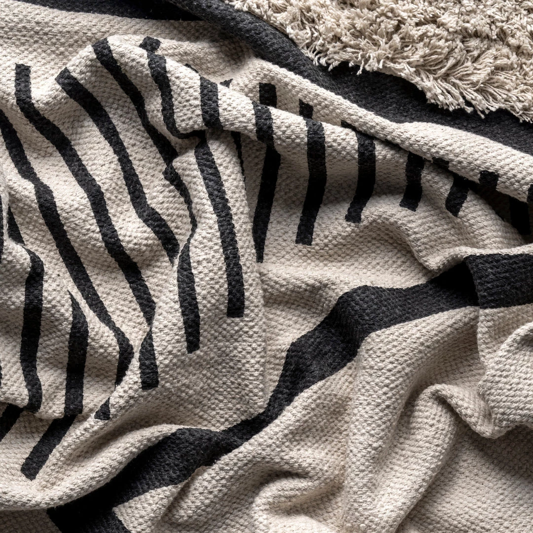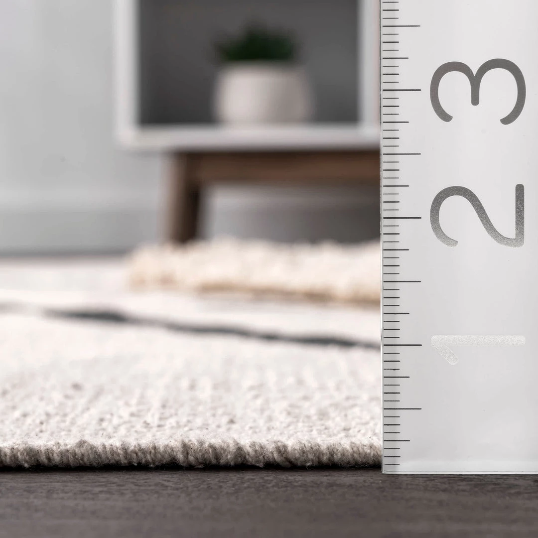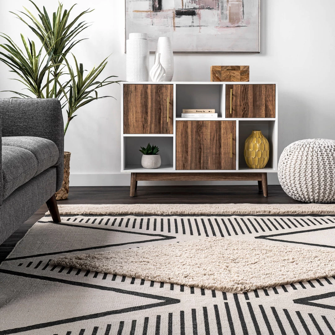 This lightweight 100% cotton rug is hand woven in India. Full of character and unique detailing, this rug features a textured shaggy pile in three places. The neutral color palette makes this rug suitable for virtually any style of decor.