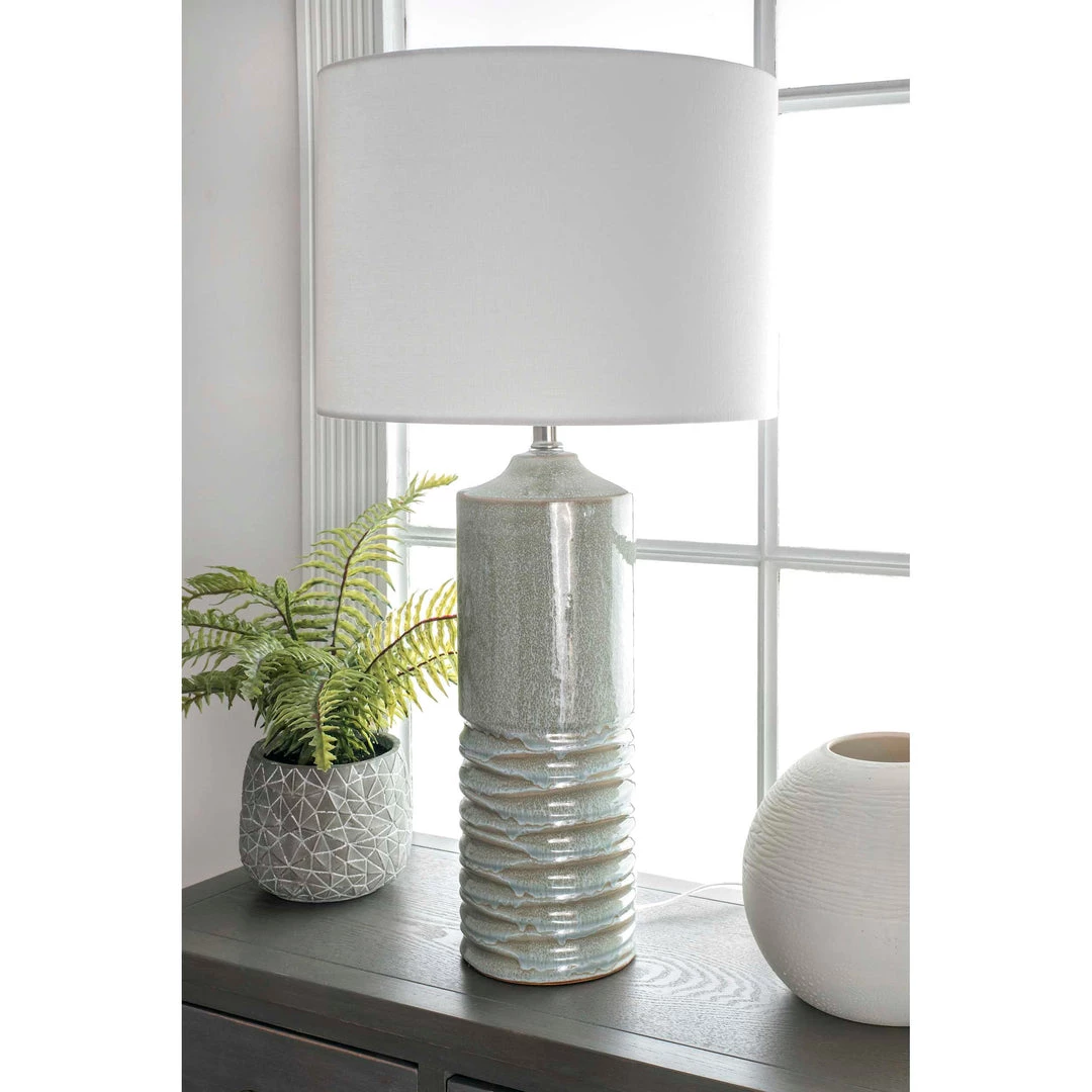 Provide accent lighting with this 27-inch table lamp. The base features a subtle textured design with a gentle blue coat complemented by an ivory linen shade for chic beauty. This mid-century modern table lamp features an on-and-off knob for easy operation and uses a 100-watt bulb (not included) for broad illumination.