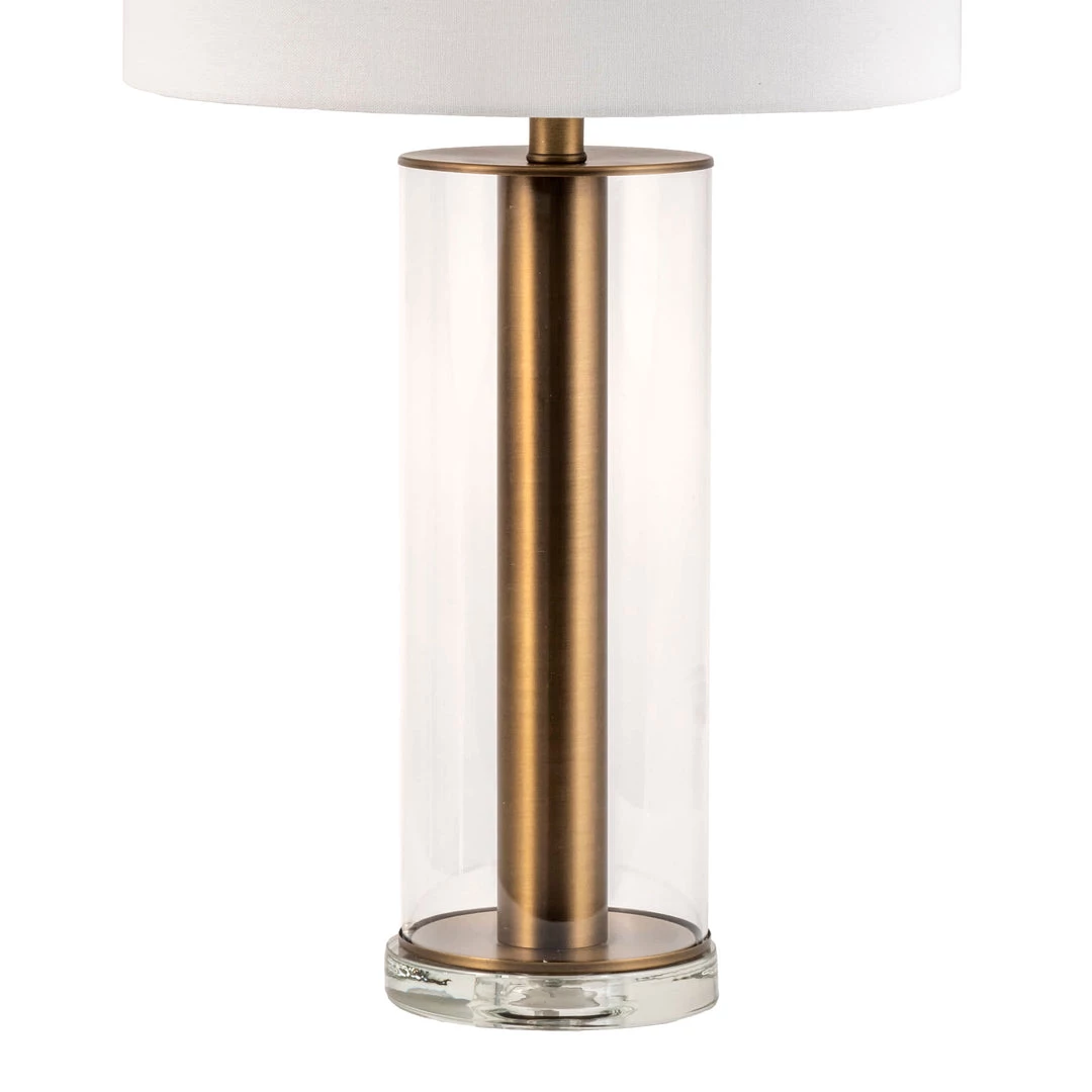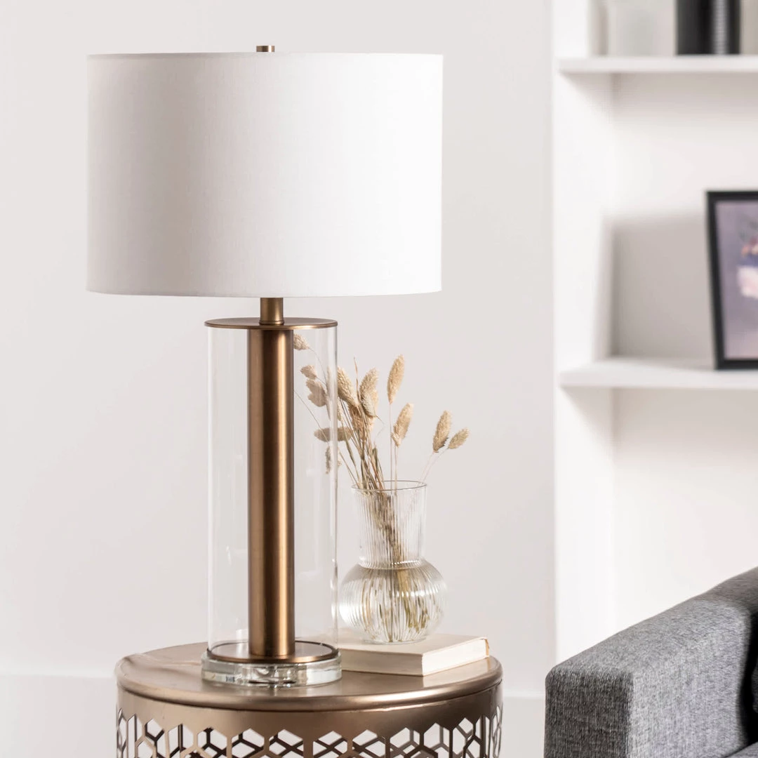 Make reading in a darkened living room or bedroom a little easier, or light up a dark hallway with this nuLOOM Hurley table lamp. Constructed with a sturdy and hefty polished brass and glass base, which looks great and provides even weight distribution to minimize the risk of tipping, this lamp includes an inline switch for easy operation. The white fabric drum shade offers gentle light diffusion to prevent harsh and uneven illumination from the lamp’s single LED E26 bulb.
