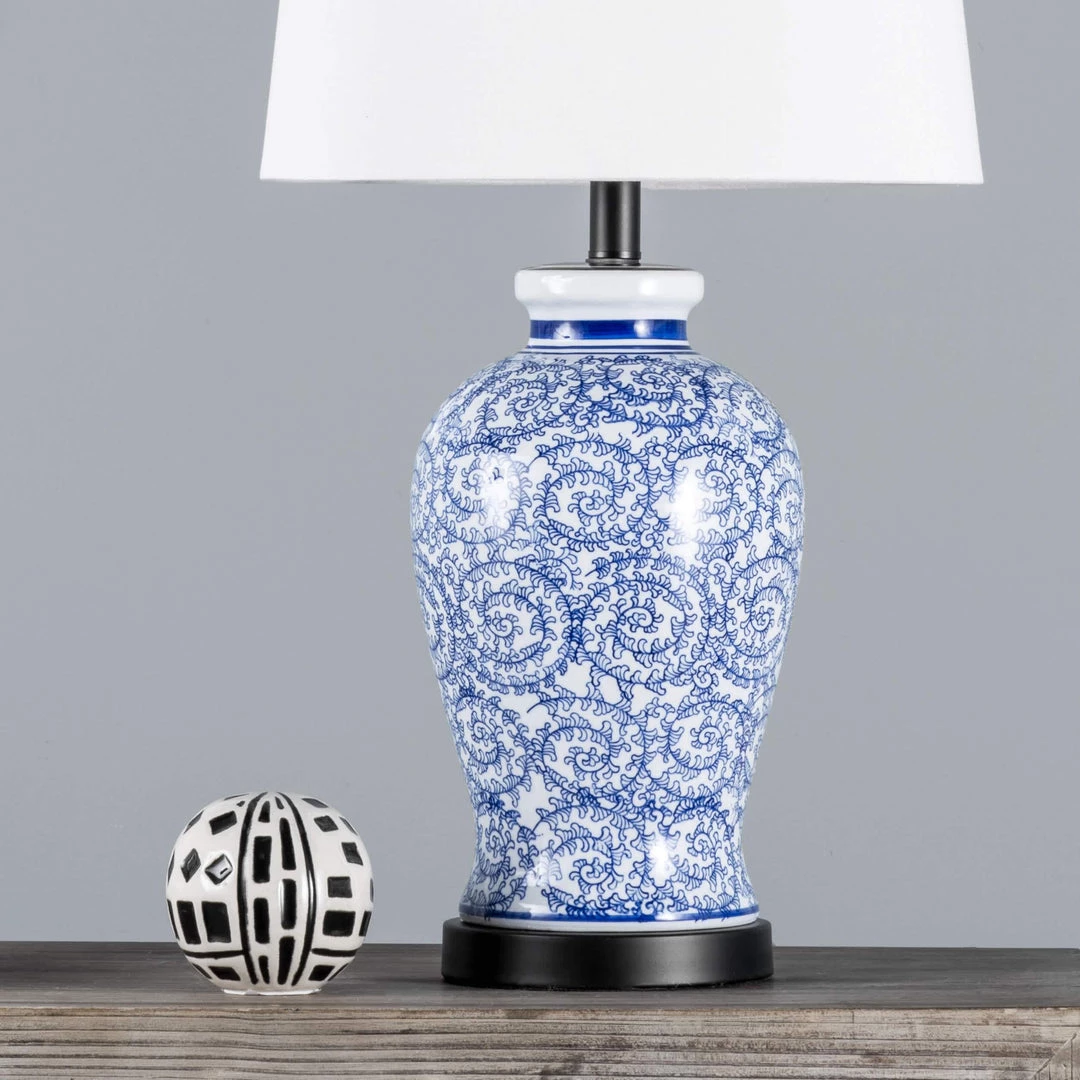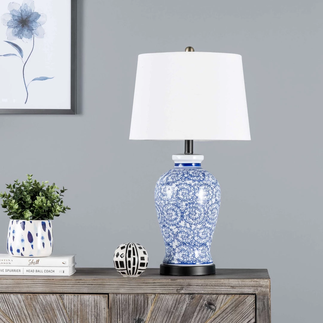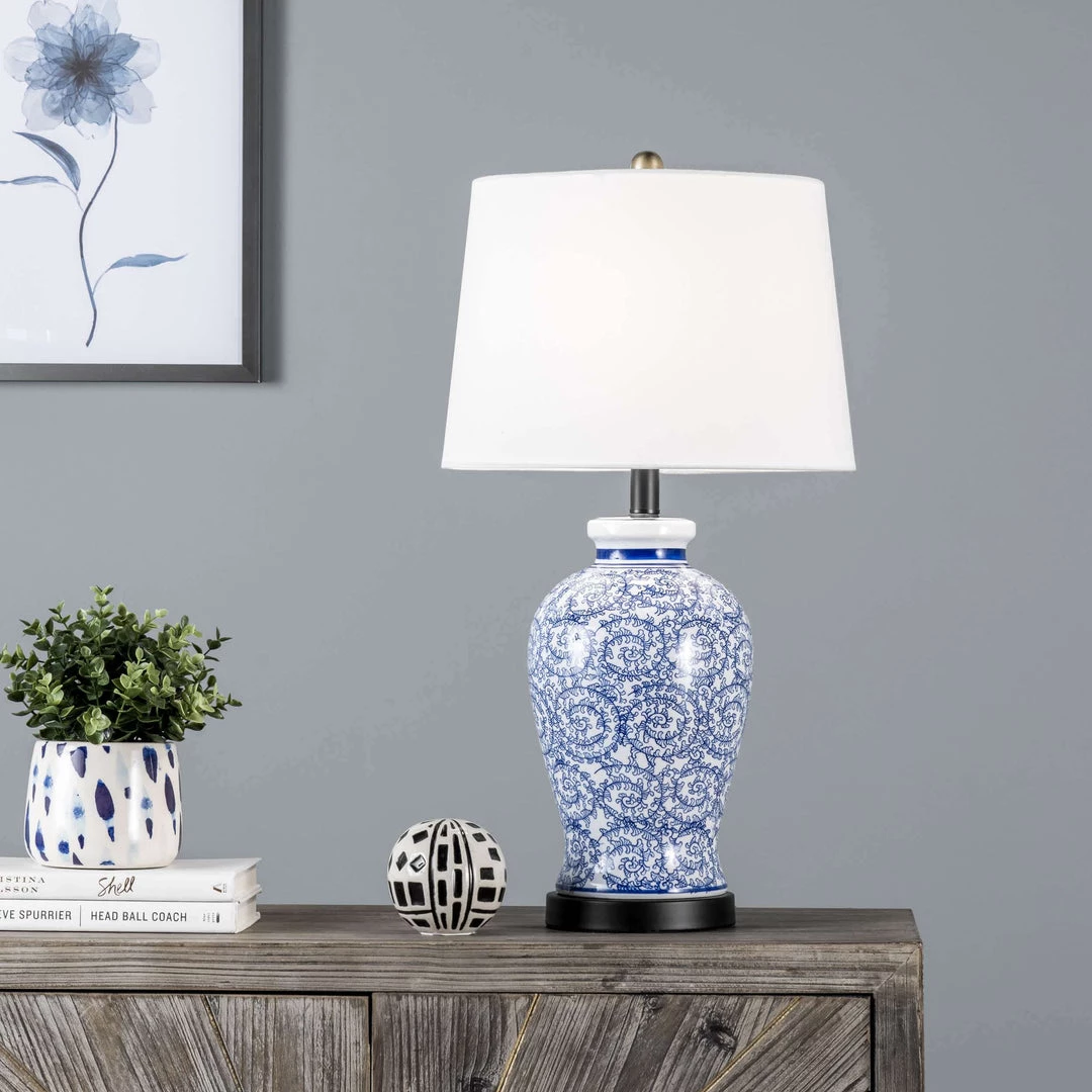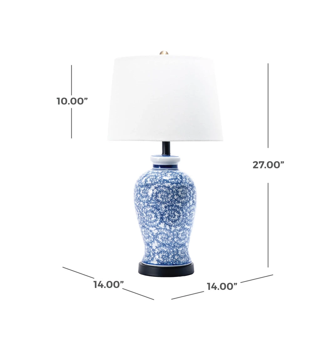 Let your room shine with the addition of this traditional, 27-inch high, ceramic table lamp. It has a tapered shade that delivers ambient lighting and will add a vibrant flair to any room.