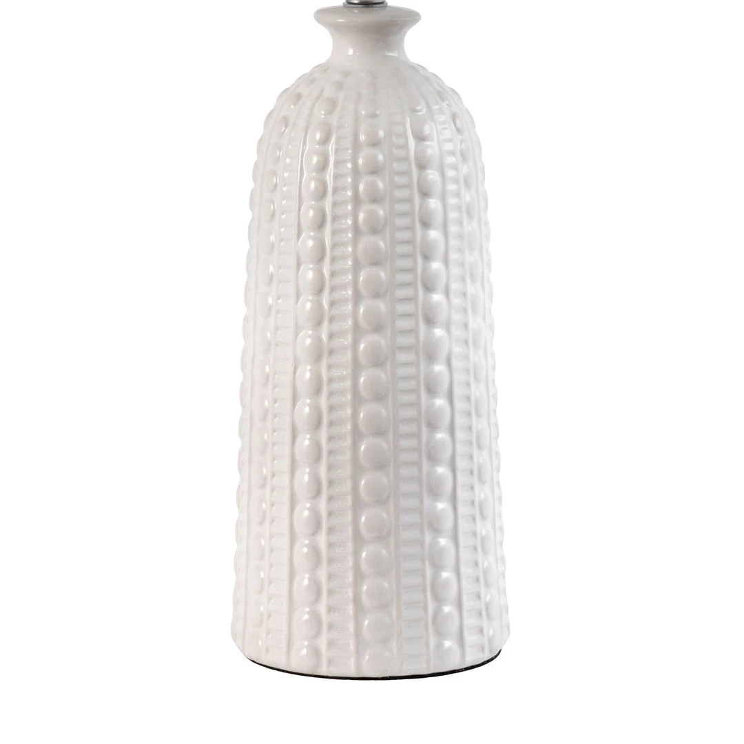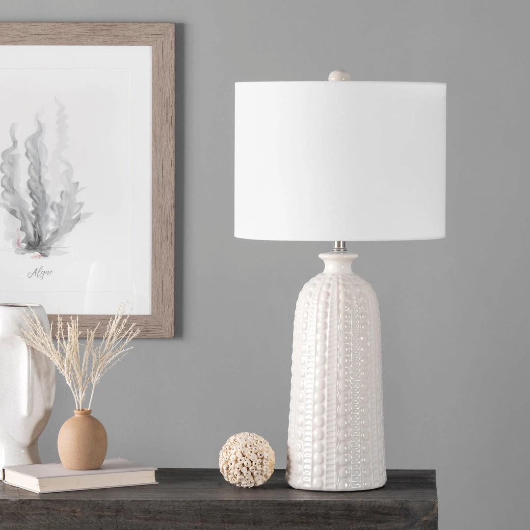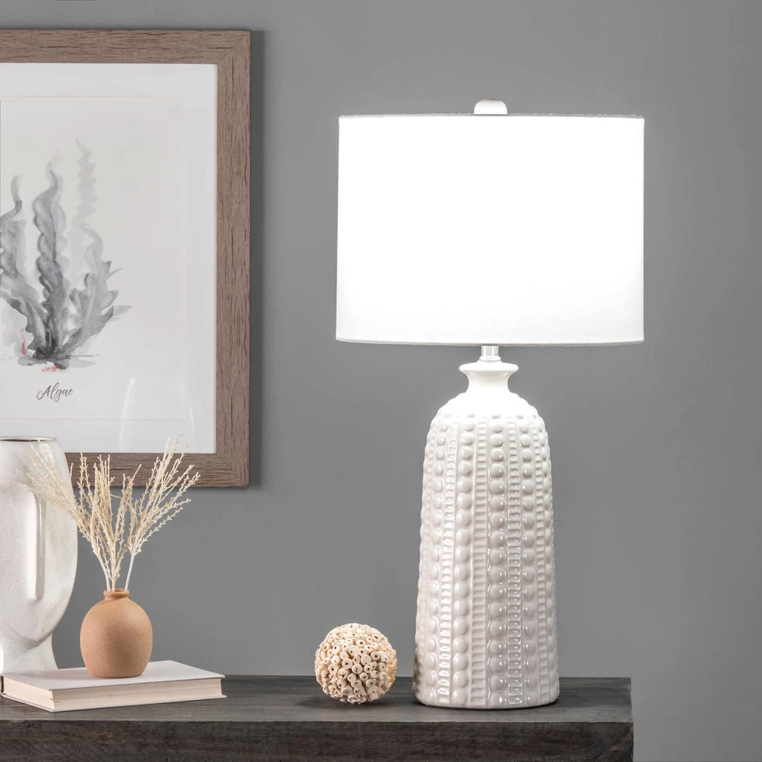 Let your room shine with the addition of this lavish abstract table lamp. It has a Linen Drum shade that delivers bright ambient lighting. Adds a vibrant flair to any room with its cream ceramic finish. It has a 15-inch wide, ivory linen, drum lampshade that delivers soft lighting.