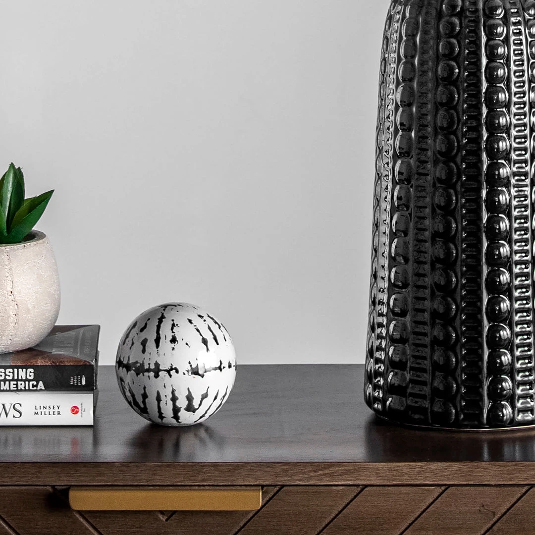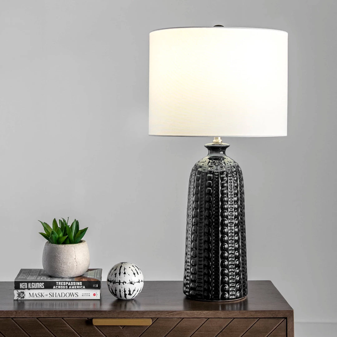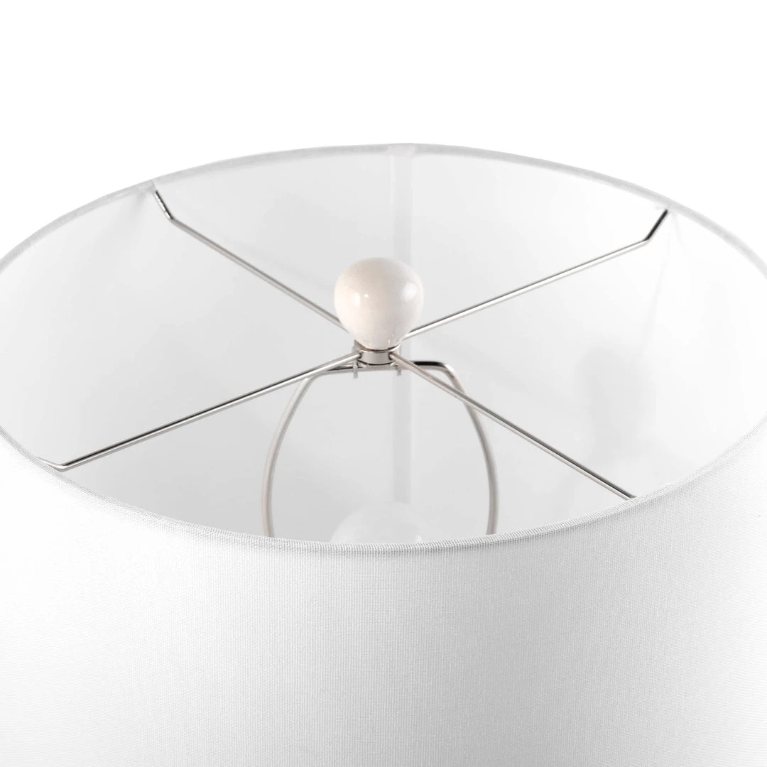 Let your room shine with the addition of this lavish abstract table lamp. It has a Linen Drum shade that delivers bright ambient lighting. Adds a vibrant flair to any room with its cream ceramic finish. It has a 15-inch wide, ivory linen, drum lampshade that delivers soft lighting.