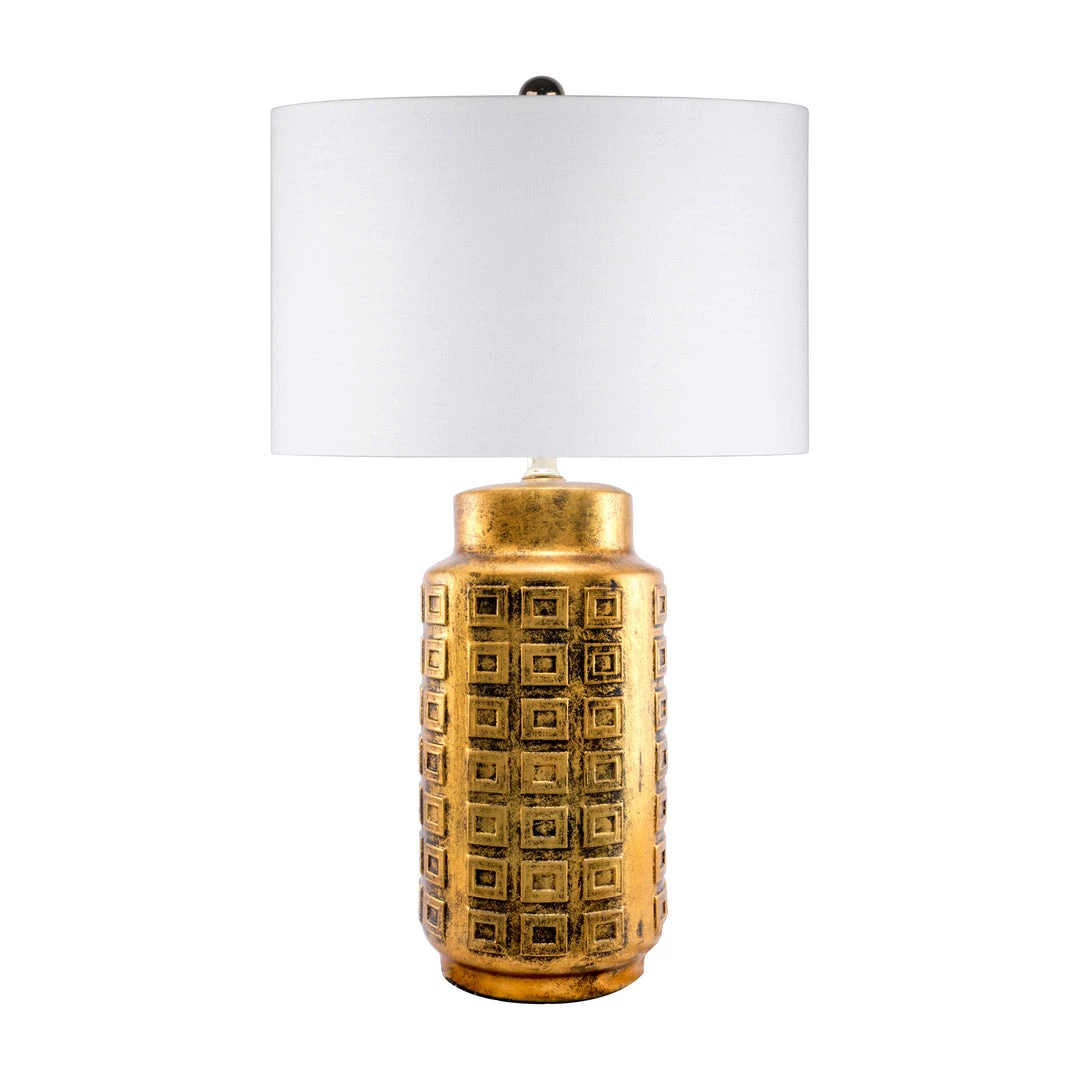 A 27-inch ceramic linen table lamp with a modern design. It has a 17-inch wide, ivory cotton, drum lampshade that delivers soft lighting. The lamp has a golden base with a stainless-steel pipe as its neck.