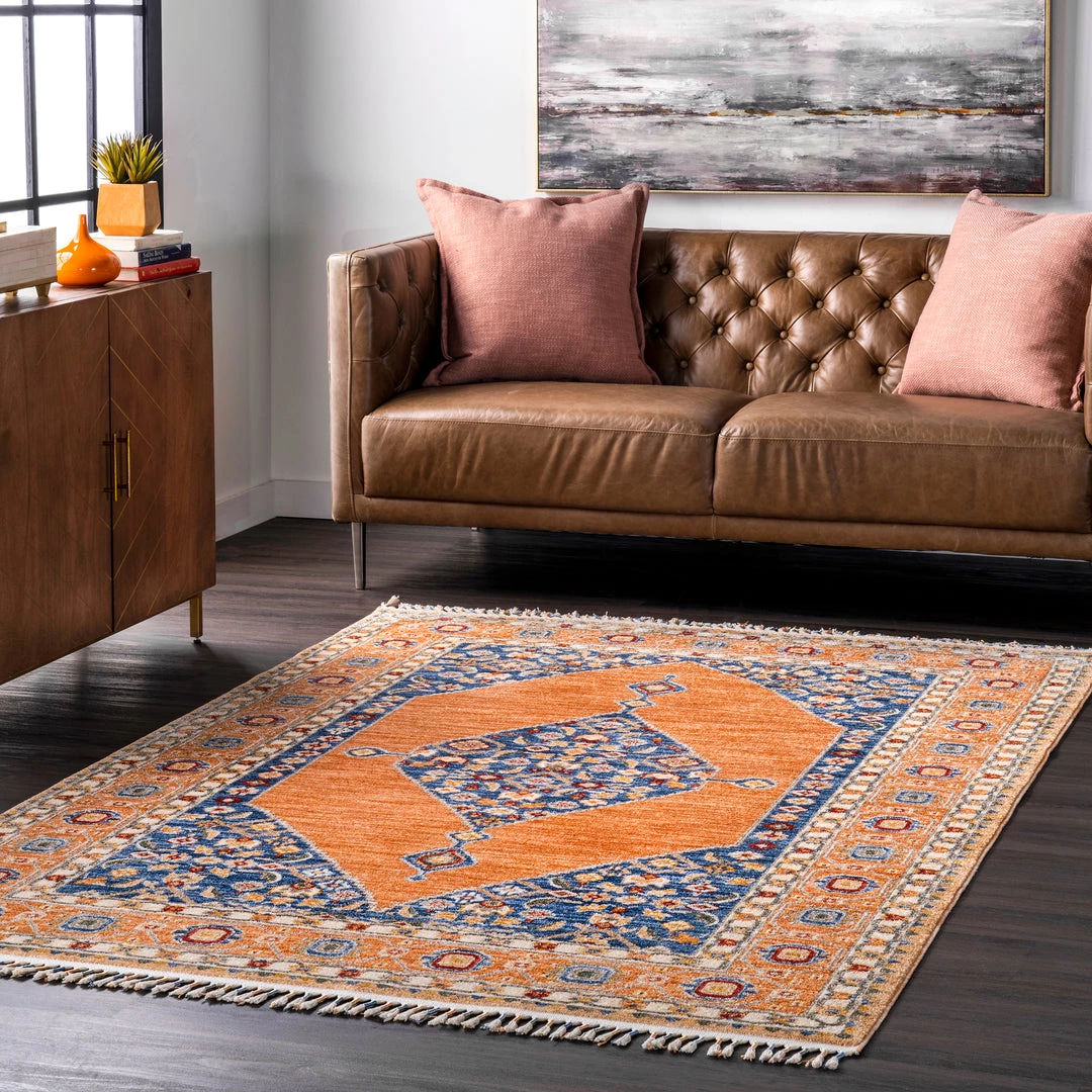 - This beautiful vibrant patterned rug features fun and unique wrapped tassels on either end