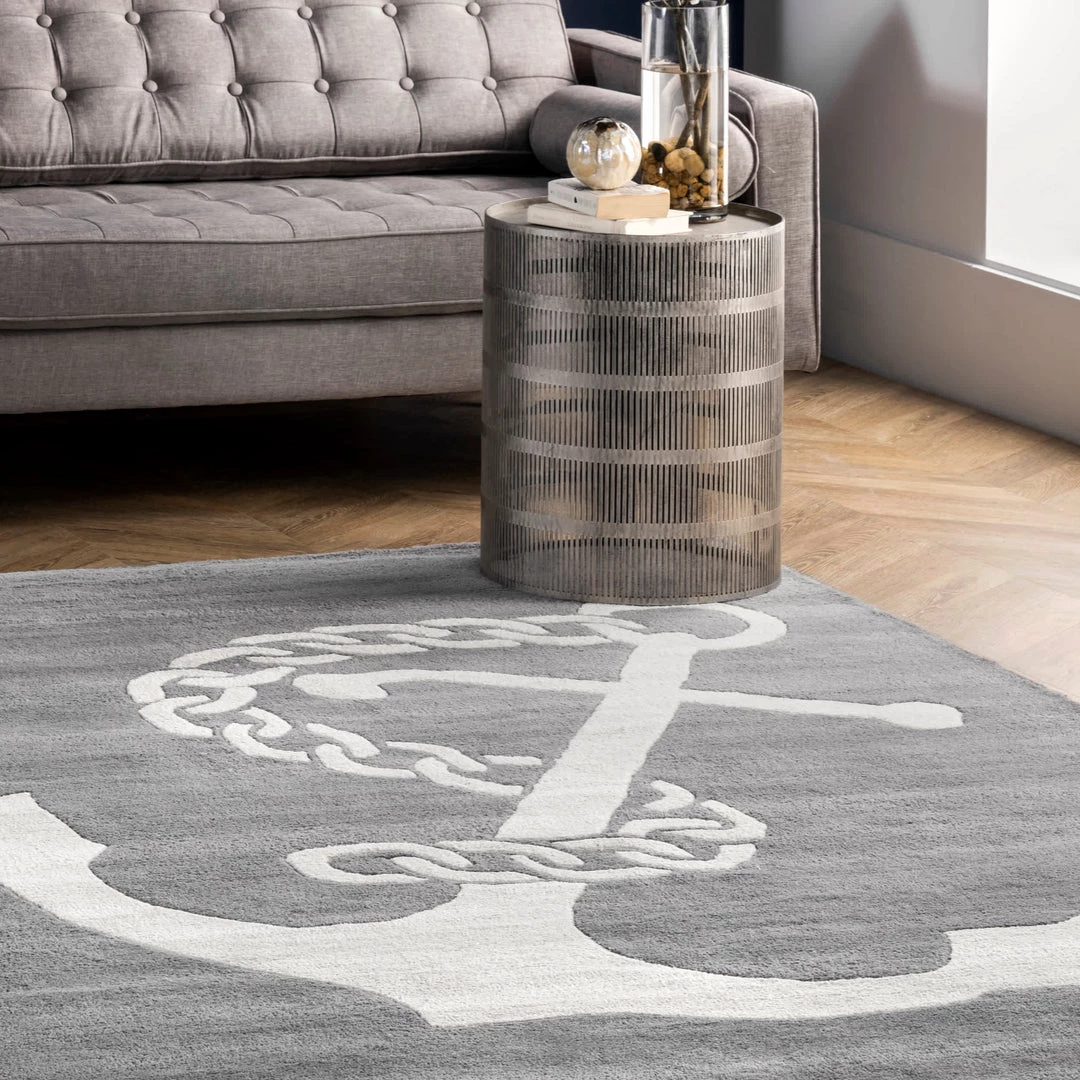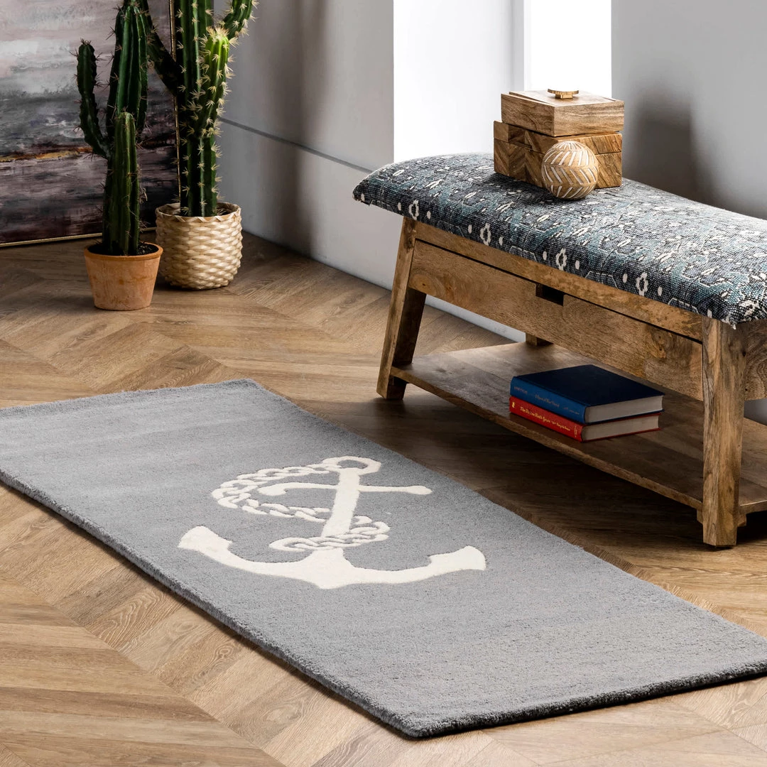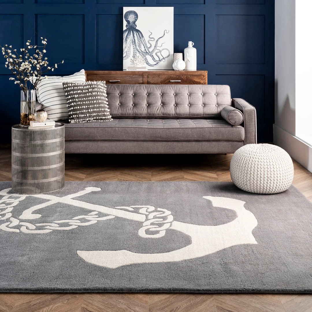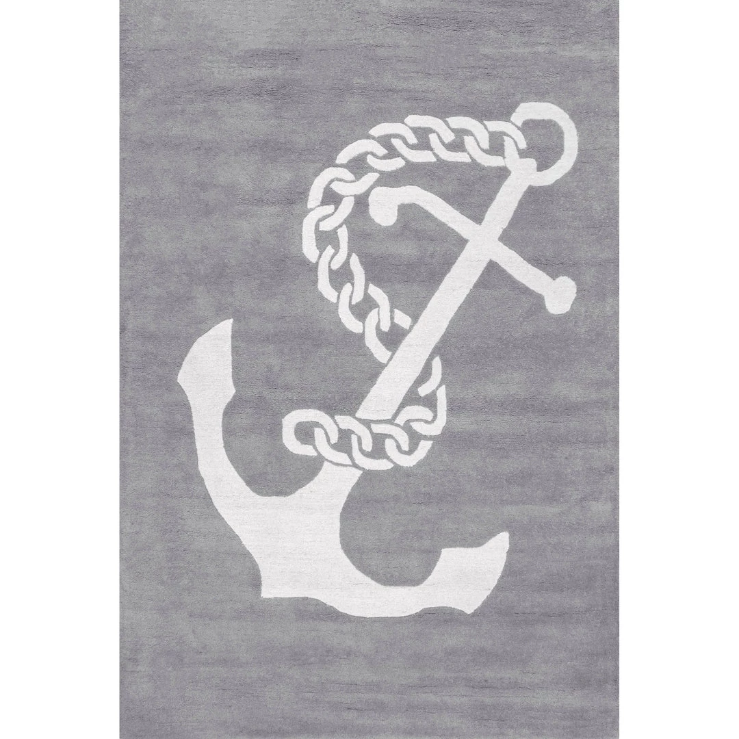 The perfect way to incorporate the peaceful feeling of the sea into your home is with this anchor area rug. Hand Tufted from wool in India this rug will surely standout.