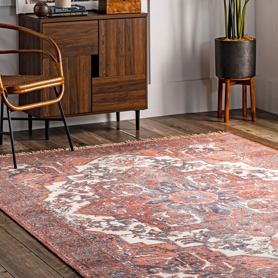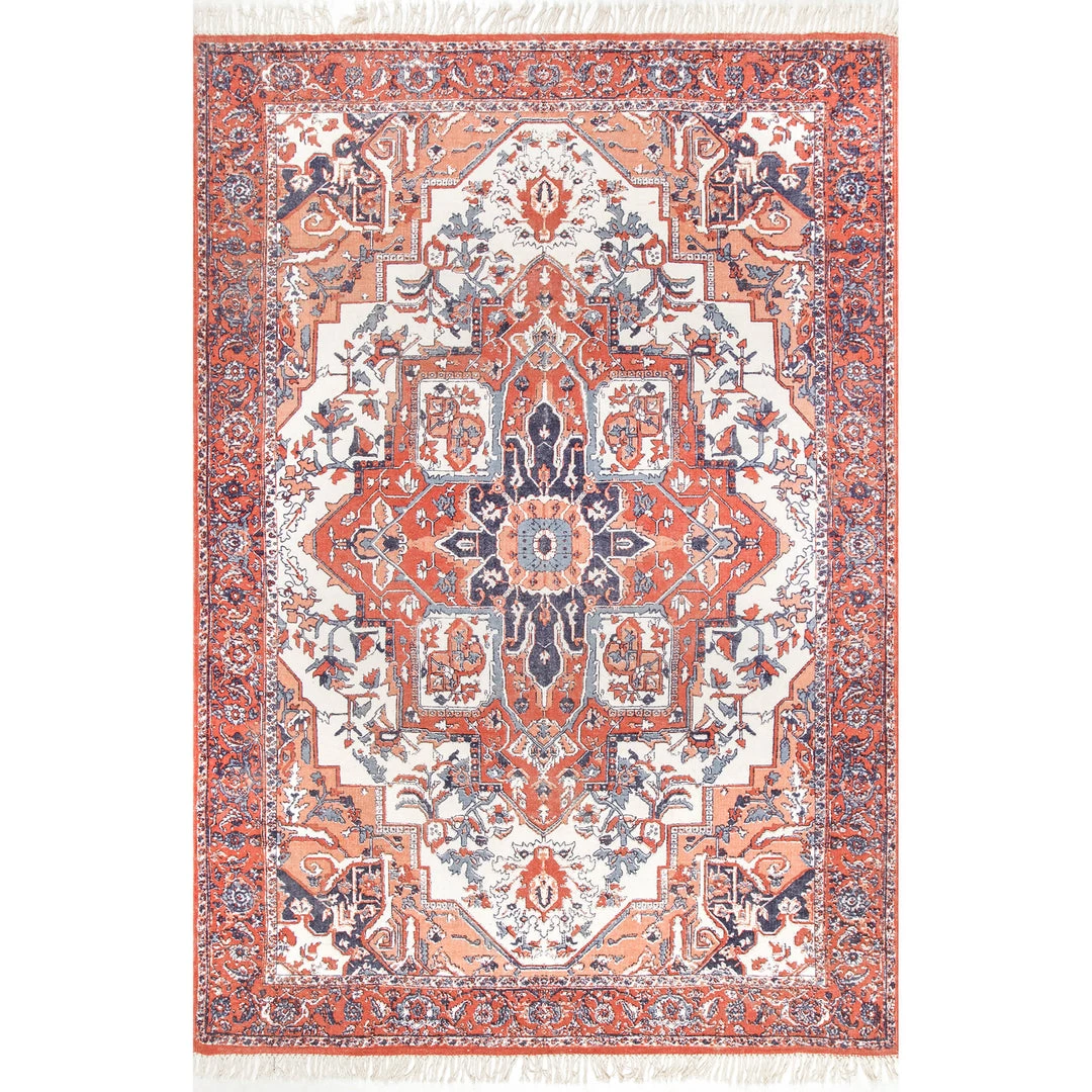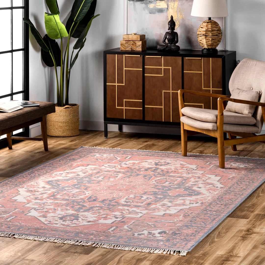 The floral medallion pattern of this rug blends vintage style with traditional comfort. This unique color combination can add charm to any space. Hand woven in India, this wool and cotton rug will warm up any space.