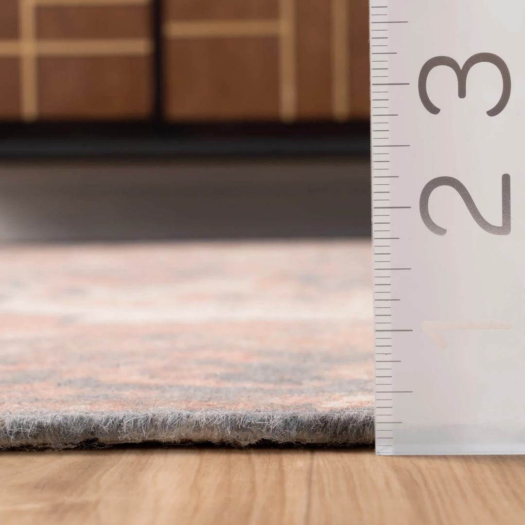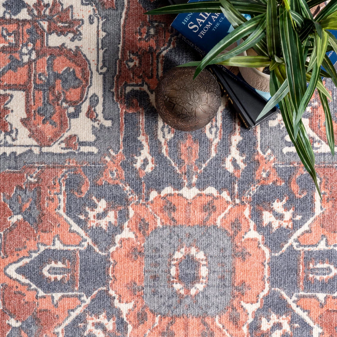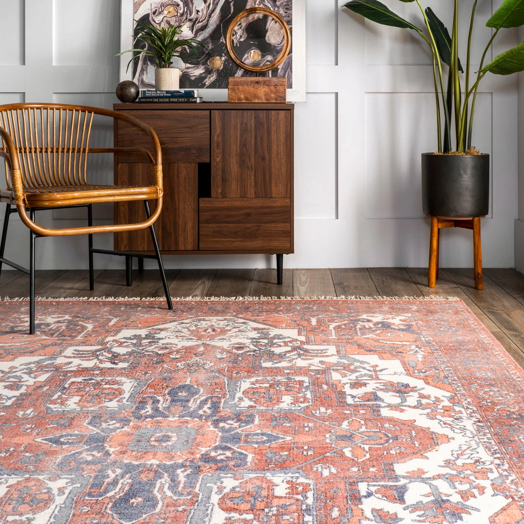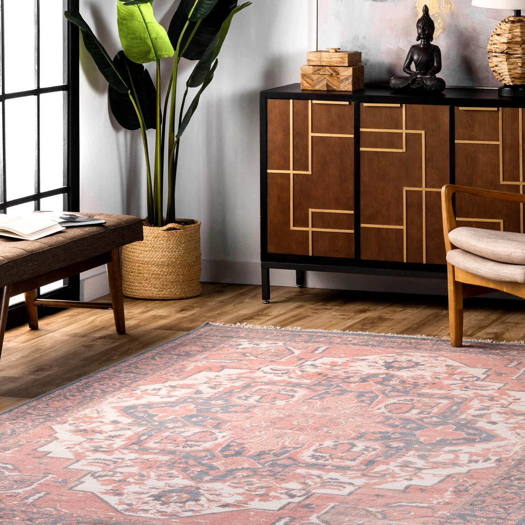 The floral medallion pattern of this rug blends vintage style with traditional comfort. This unique color combination can add charm to any space. Hand woven in India, this wool and cotton rug will warm up any space.