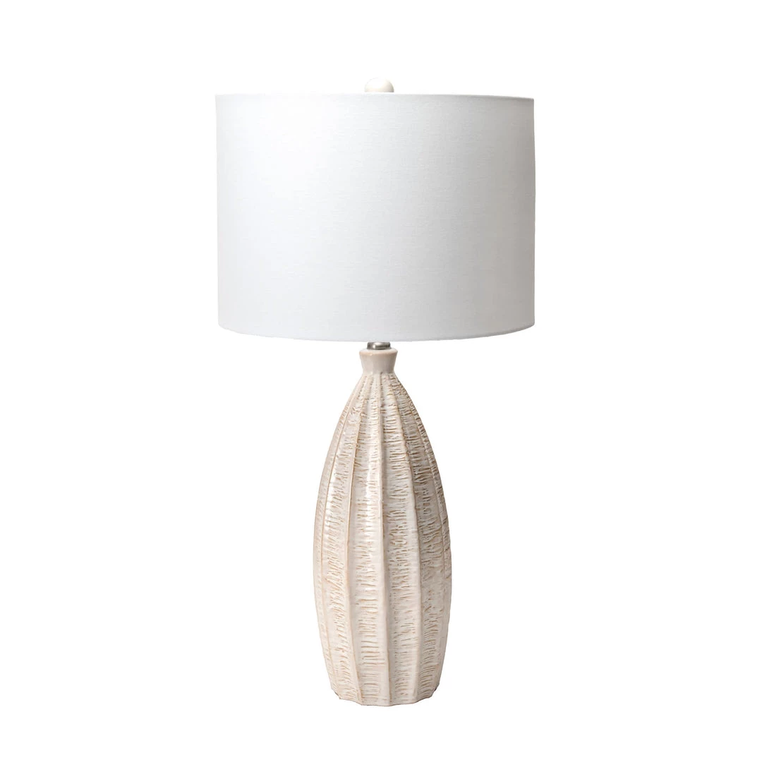 Update your home decor with the nuLOOM contemporary ceramic table lamp in beige. This lamp features a ceramic base in a striated design that is perfect for a beach-motif home or any place that could use a casual touch. The white linen shade offers plenty of light from any bulb between 60 and 100 watts. This lamp measures 27 inches, making it a good choice as a light source on tables or night stands, and the on/off switch is easy to operate.