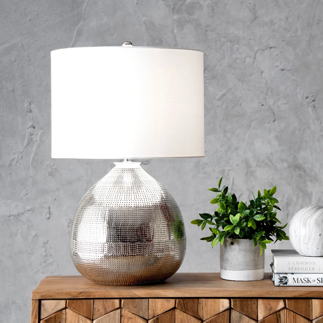 Distribute light sources throughout a given room with this Islip traditional table lamp by nuLOOM. Easily used to adorn a bedside, buffet, or end table, this table lamp has a metal base for stability and sturdiness and a nickel finish for a classic, clean look. It accommodates a single bulb of less than 60 watts for softer illumination, with a durable cotton drum shade that expedites a gently diffused glow. Thanks to a voluminous base, this table lamp calls modern sculpture to mind, complementing contemporary room designs.