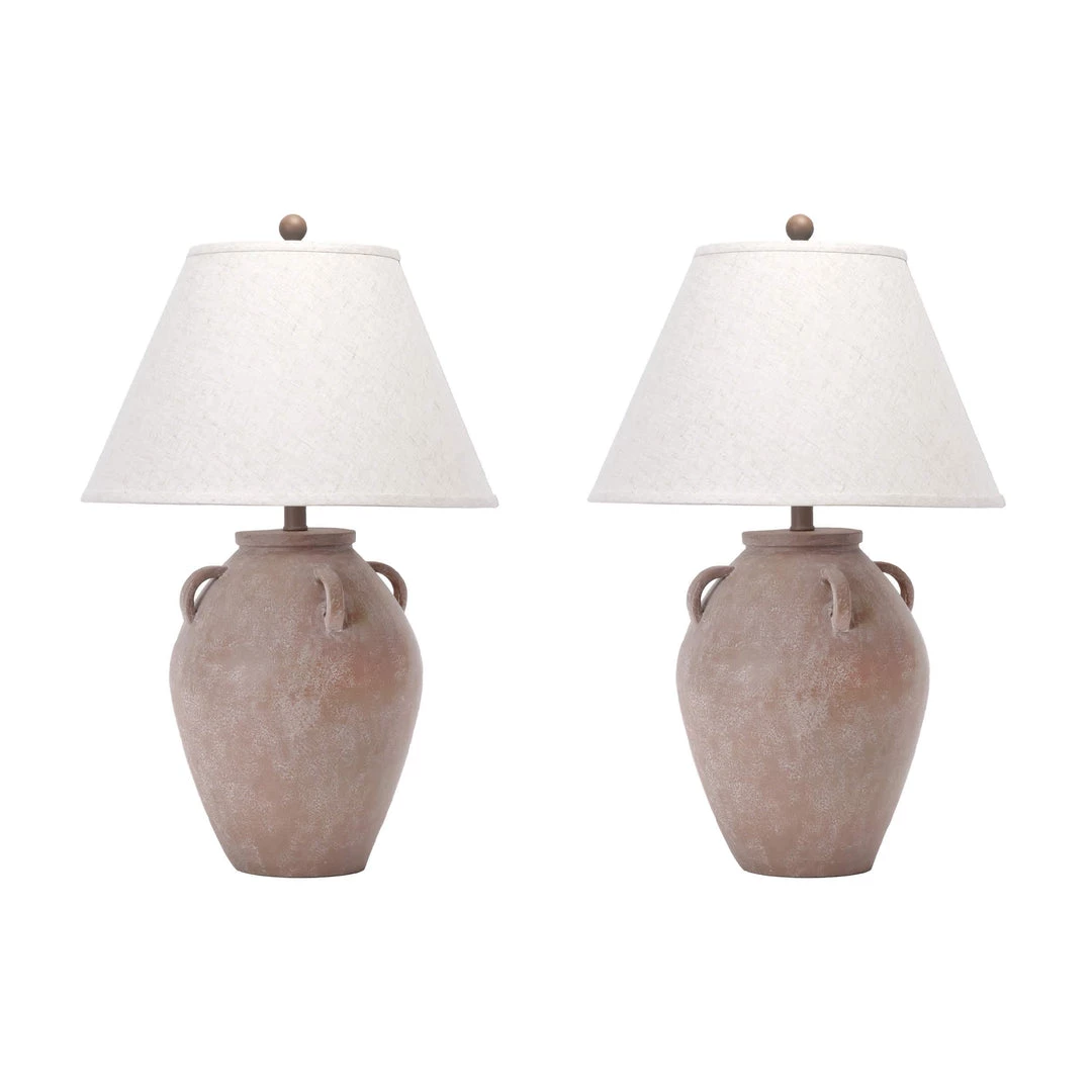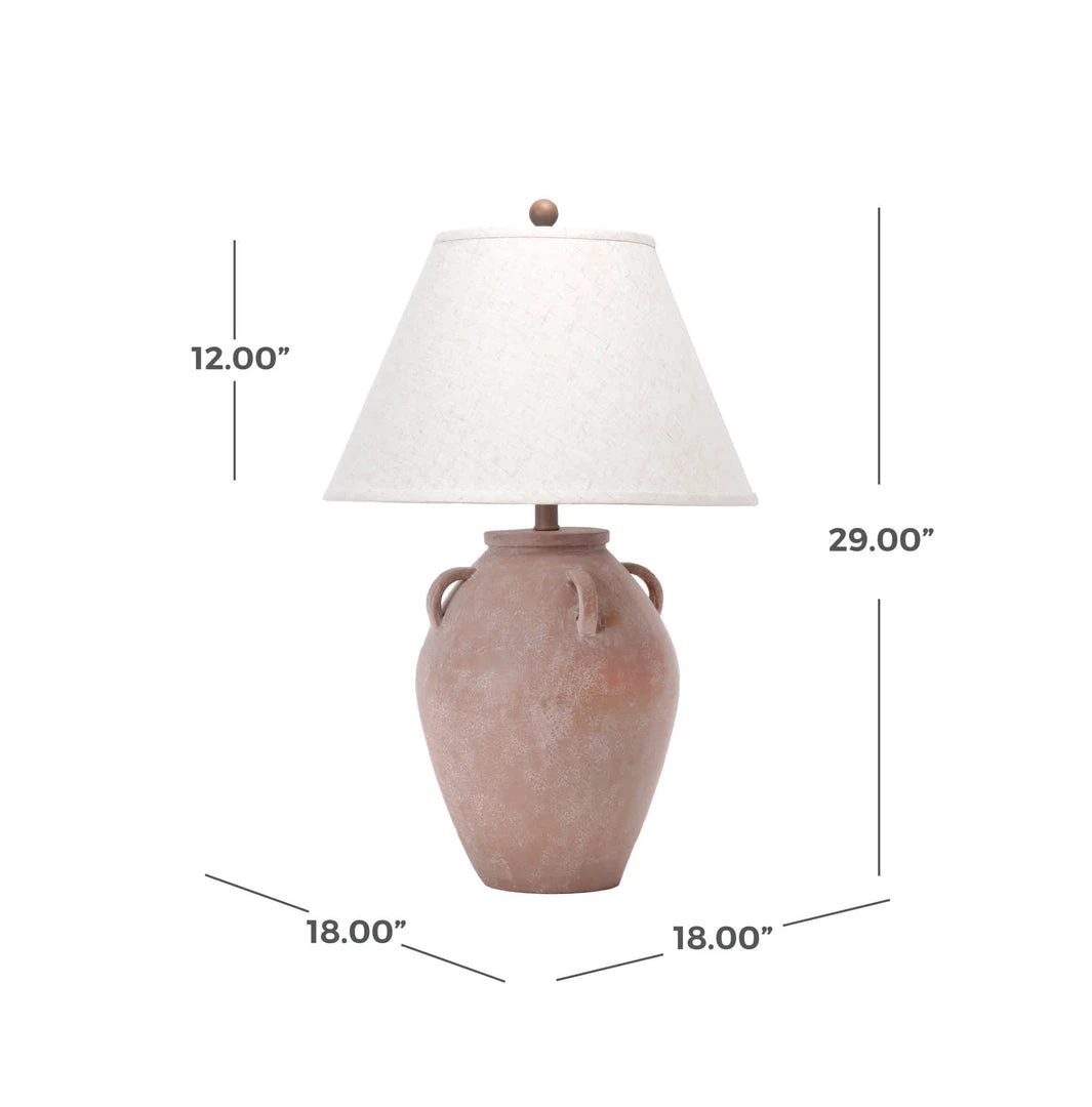 Top off a side table with a decorative farmhouse style table lamp. A 29-inch tall resin urn shaped base will fit easily onto your table, desk, or nightstand. A simple fabric empire shade pops on the top of this lamp easily, creating a balanced look with diffused light.