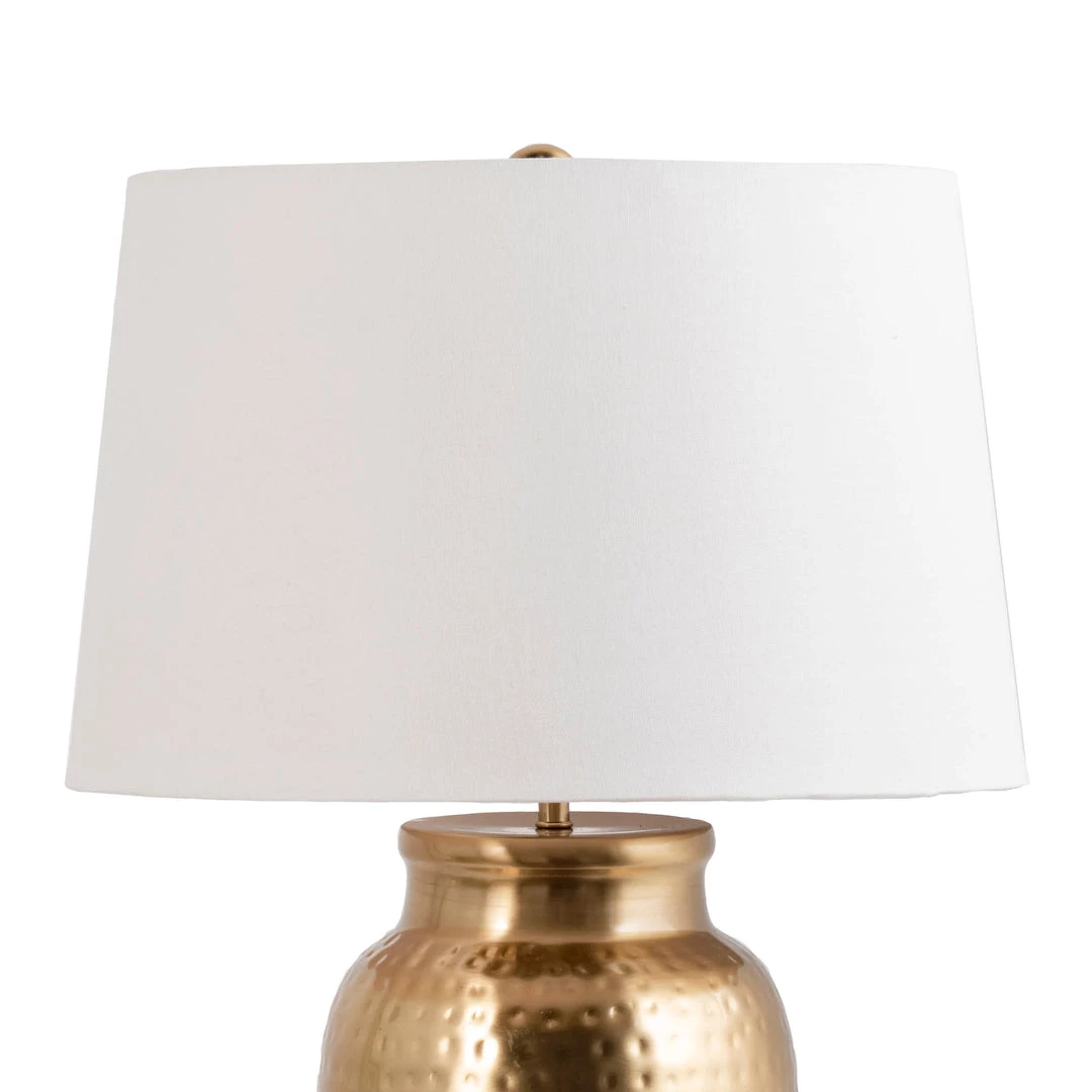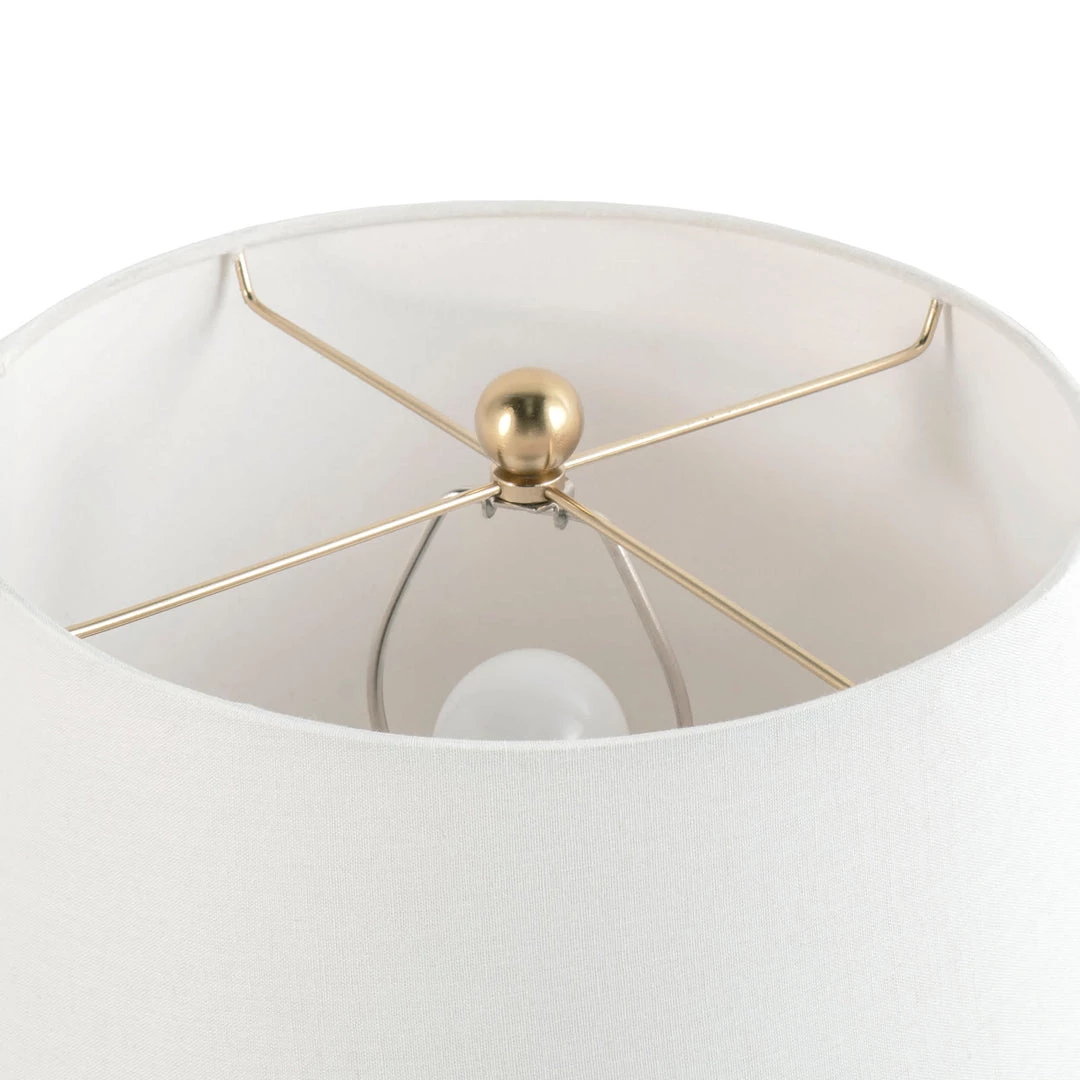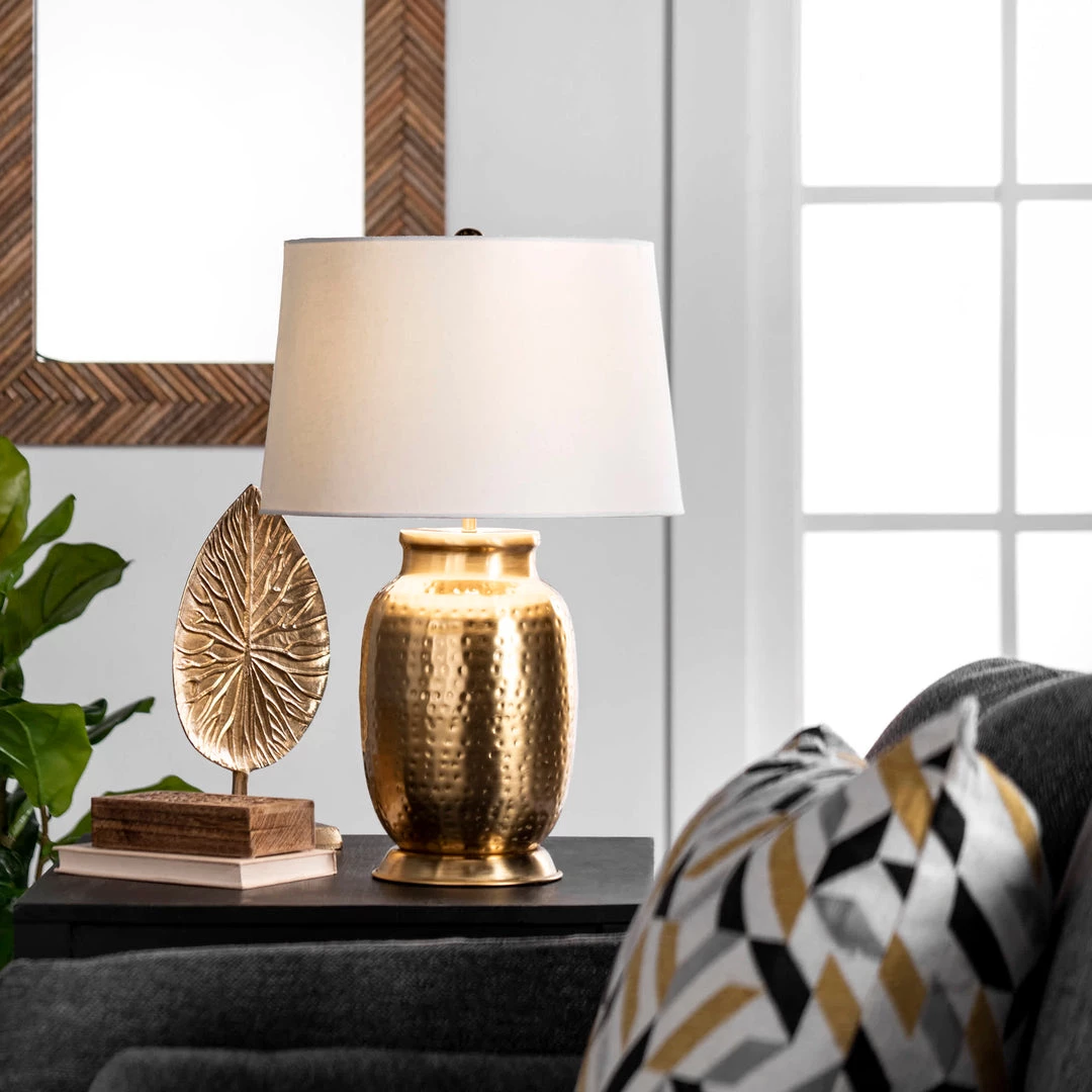 Let your room shine with the addition of this modern, 23-inch high, Iron table lamp. It has a Cotton shade that delivers bright ambient lighting. Add an vibrant flair to any room with its Brass finish.