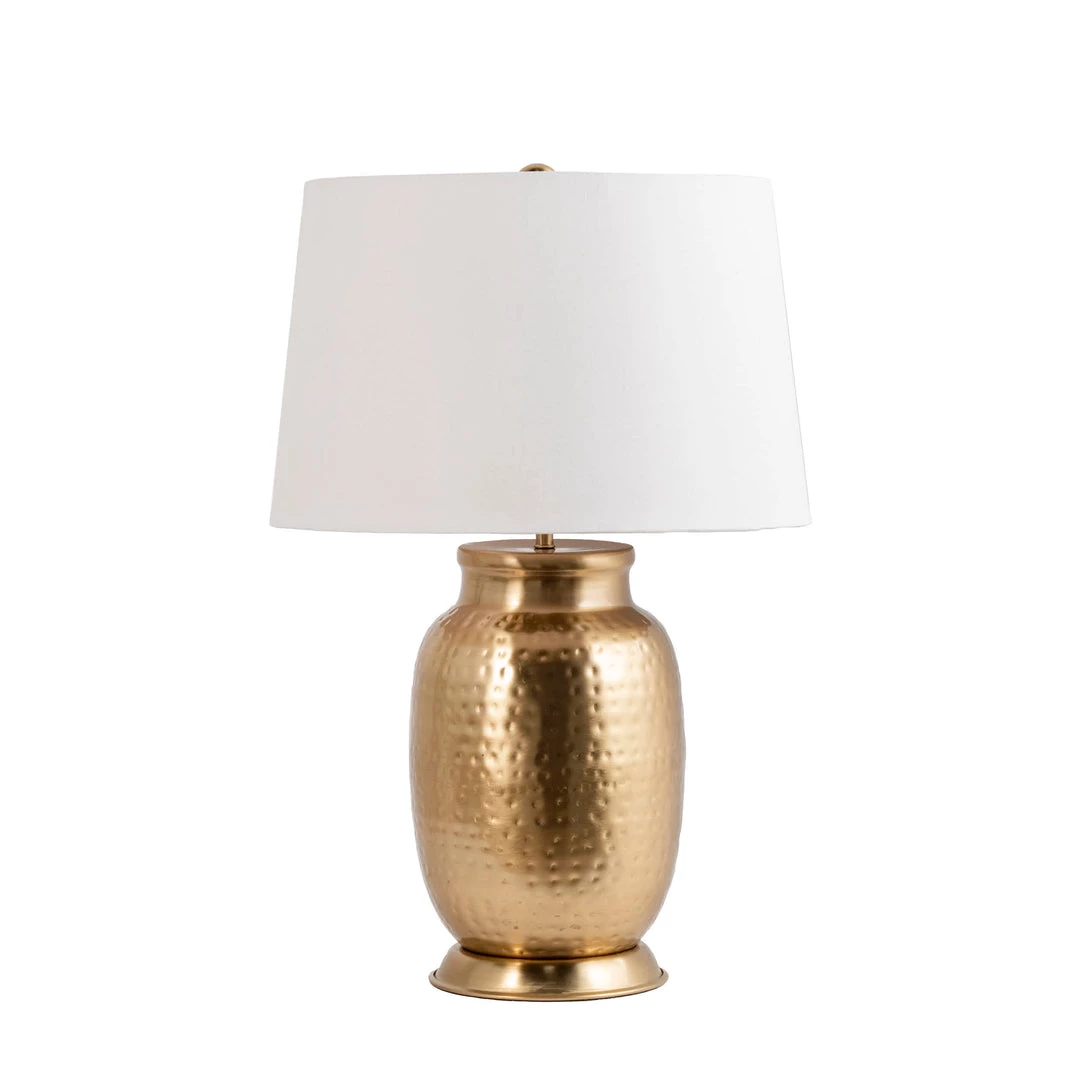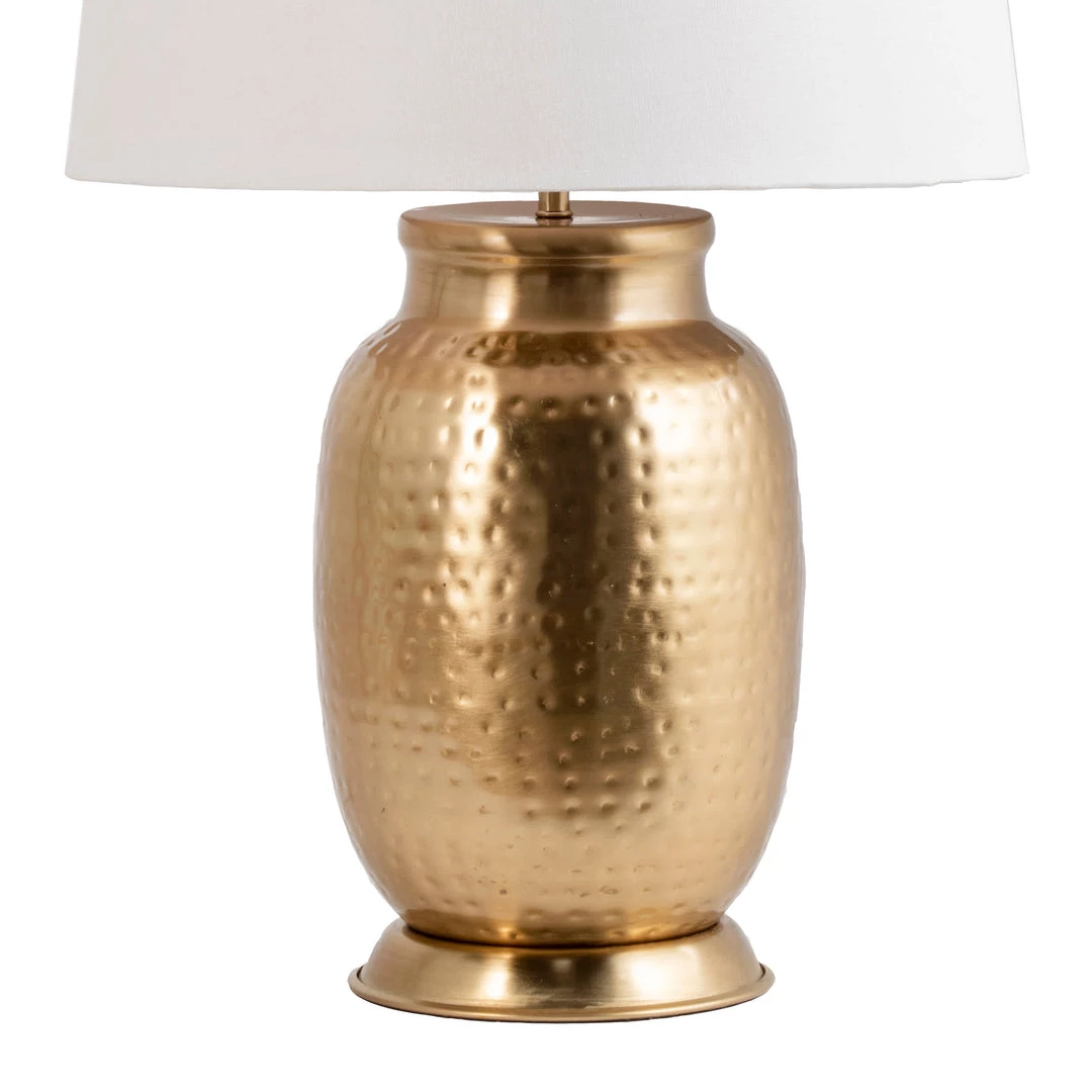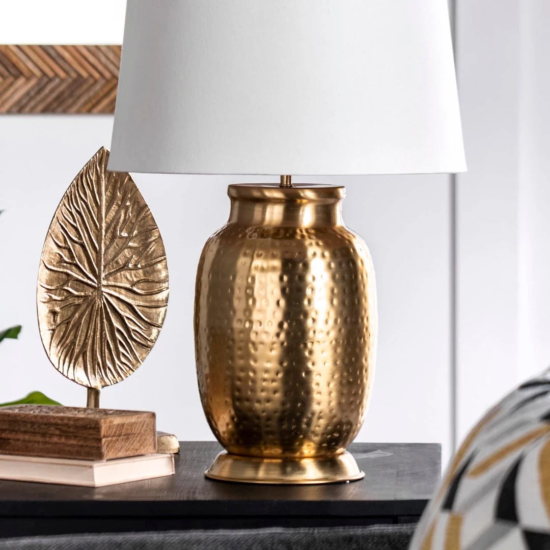 Let your room shine with the addition of this modern, 23-inch high, Iron table lamp. It has a Cotton shade that delivers bright ambient lighting. Add an vibrant flair to any room with its Brass finish.
