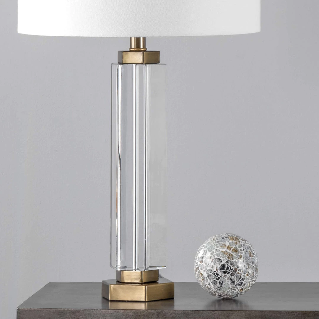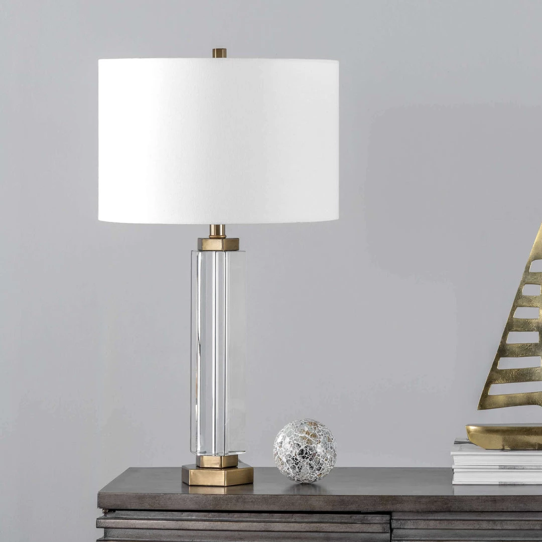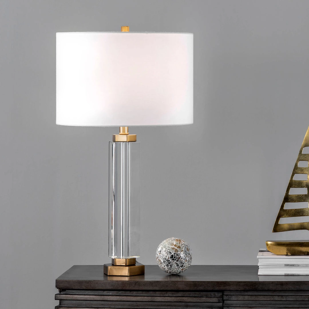 Top off a side table with a decorative transitional style table lamp. A 27-inch tall crystal pillar base will fit easily onto your table, desk, or nightstand. A simple fabric drum shade pops on the top of this lamp easily, creating a balanced look with diffused light.