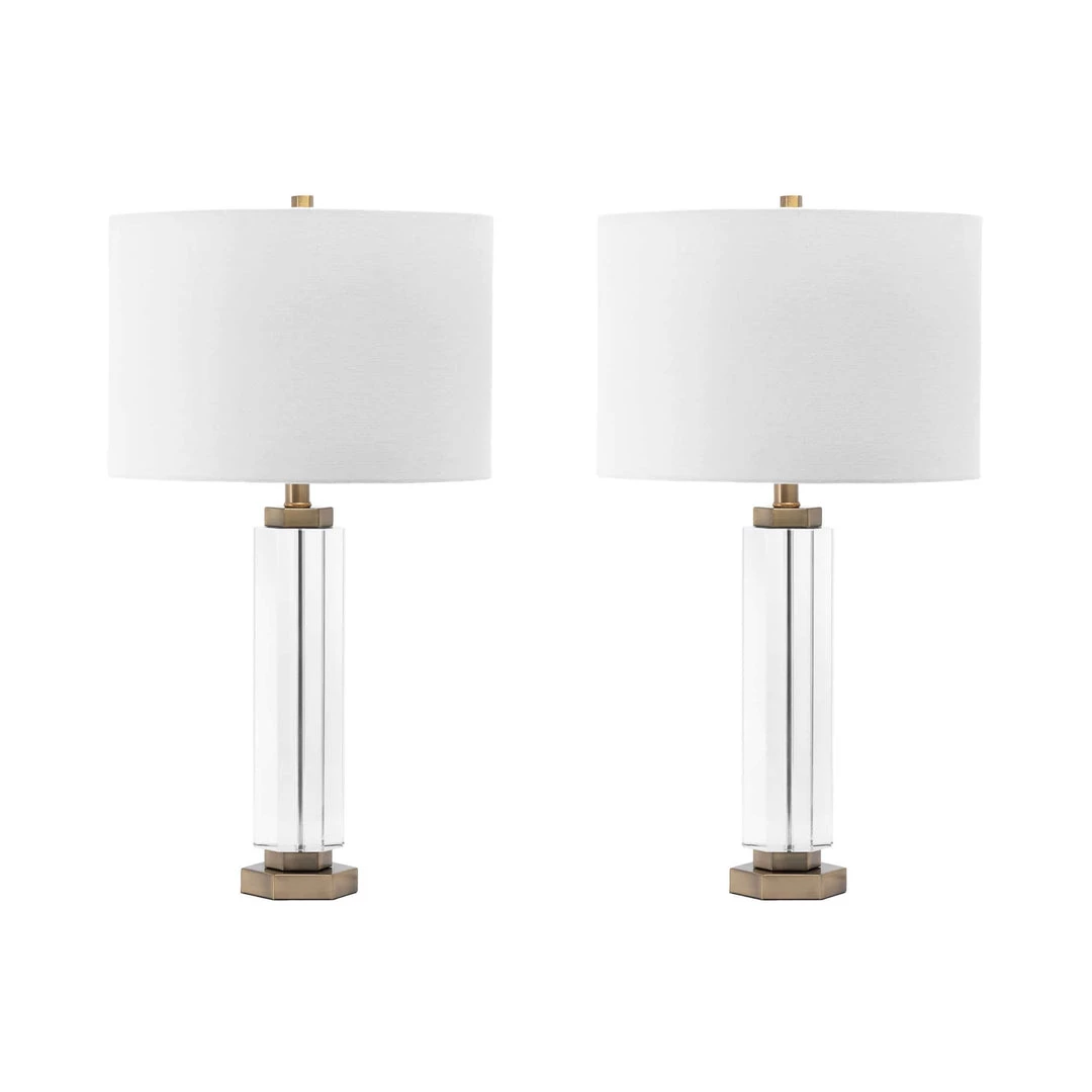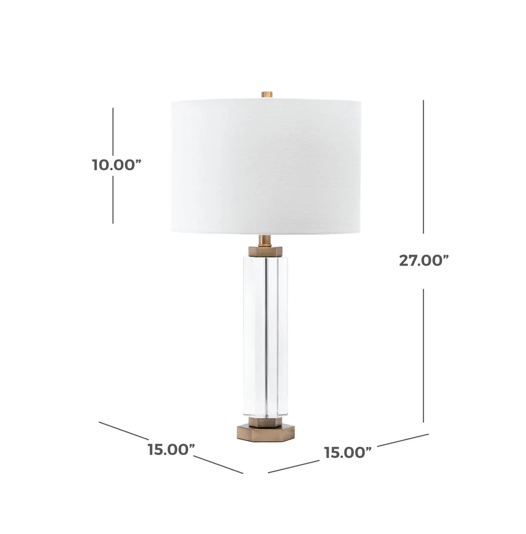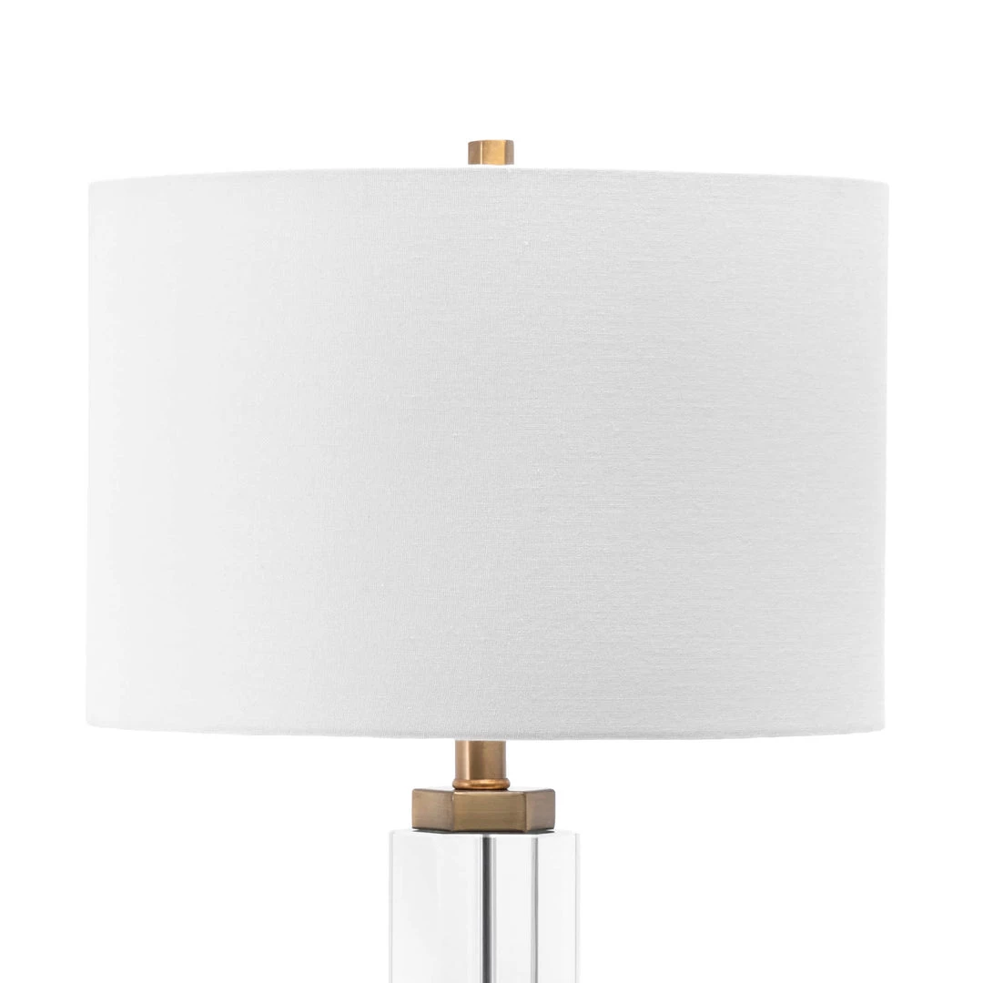 Top off a side table with a decorative transitional style table lamp. A 27-inch tall crystal pillar base will fit easily onto your table, desk, or nightstand. A simple fabric drum shade pops on the top of this lamp easily, creating a balanced look with diffused light.