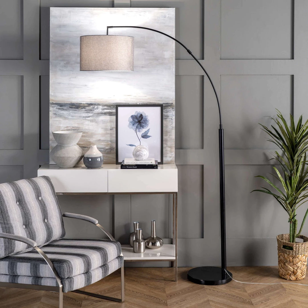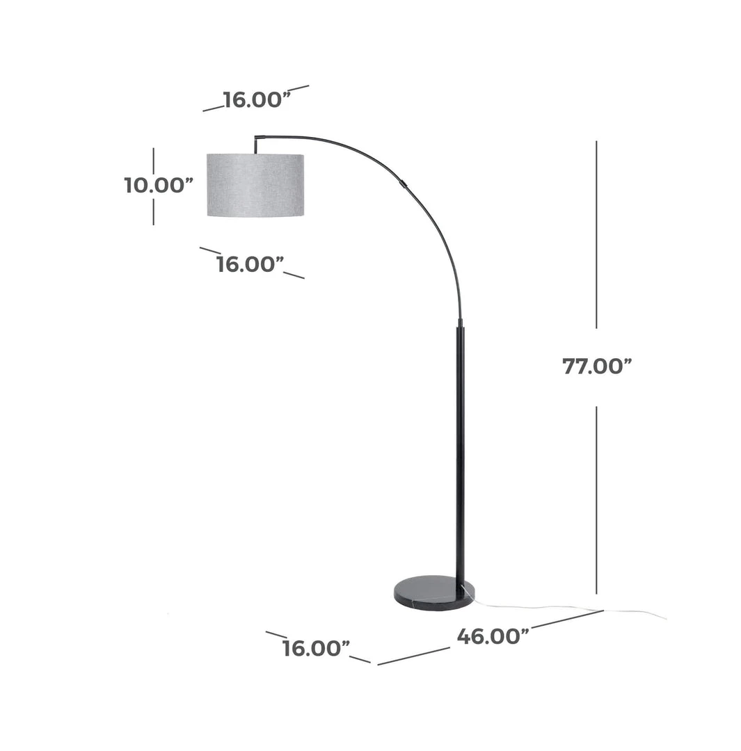 Warm and luminous, with a contemporary arched base, this floor lamp will make a refreshing and stylish addition to your space. The cloth shade diffuses the light beautifully for ample illumination, and the metal body provides a sturdy base.