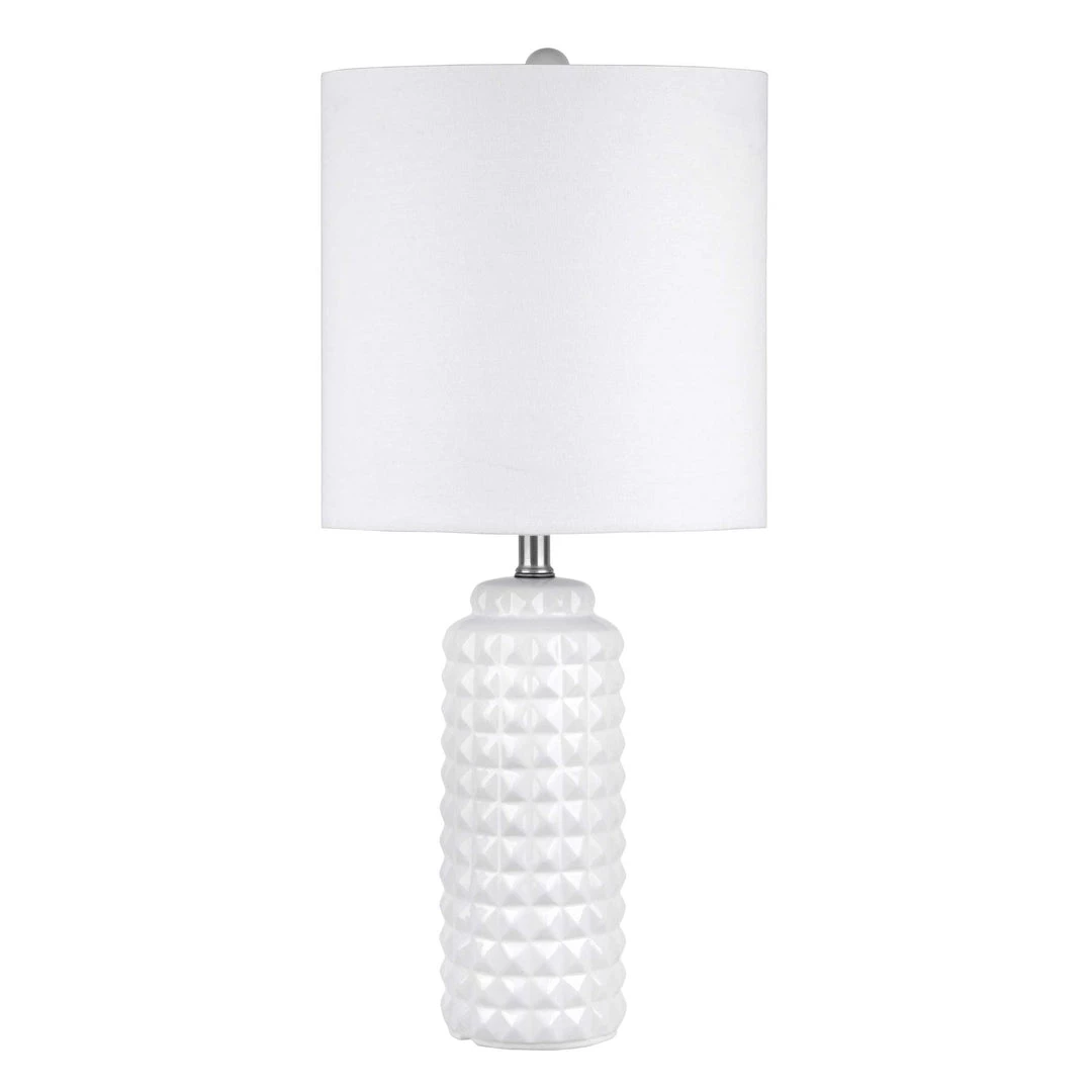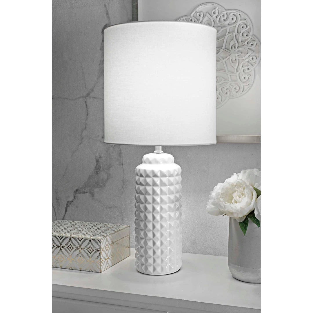 A 26-inch ceramic linen table lamp with a modern design. It has a 12-inch wide, ivory cotton, drum lampshade that delivers soft lighting. The lamp has a white base with a stainless-steel pipe as its neck.