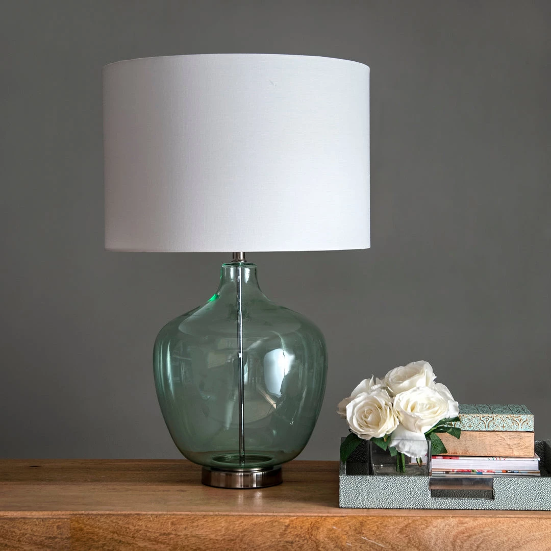 Let your room shine with the addition of this modern, 29-inch high, glass lamp. Its linen shade delivers ambient lighting to an area. Add a vibrant flair to any room with its blue finish.