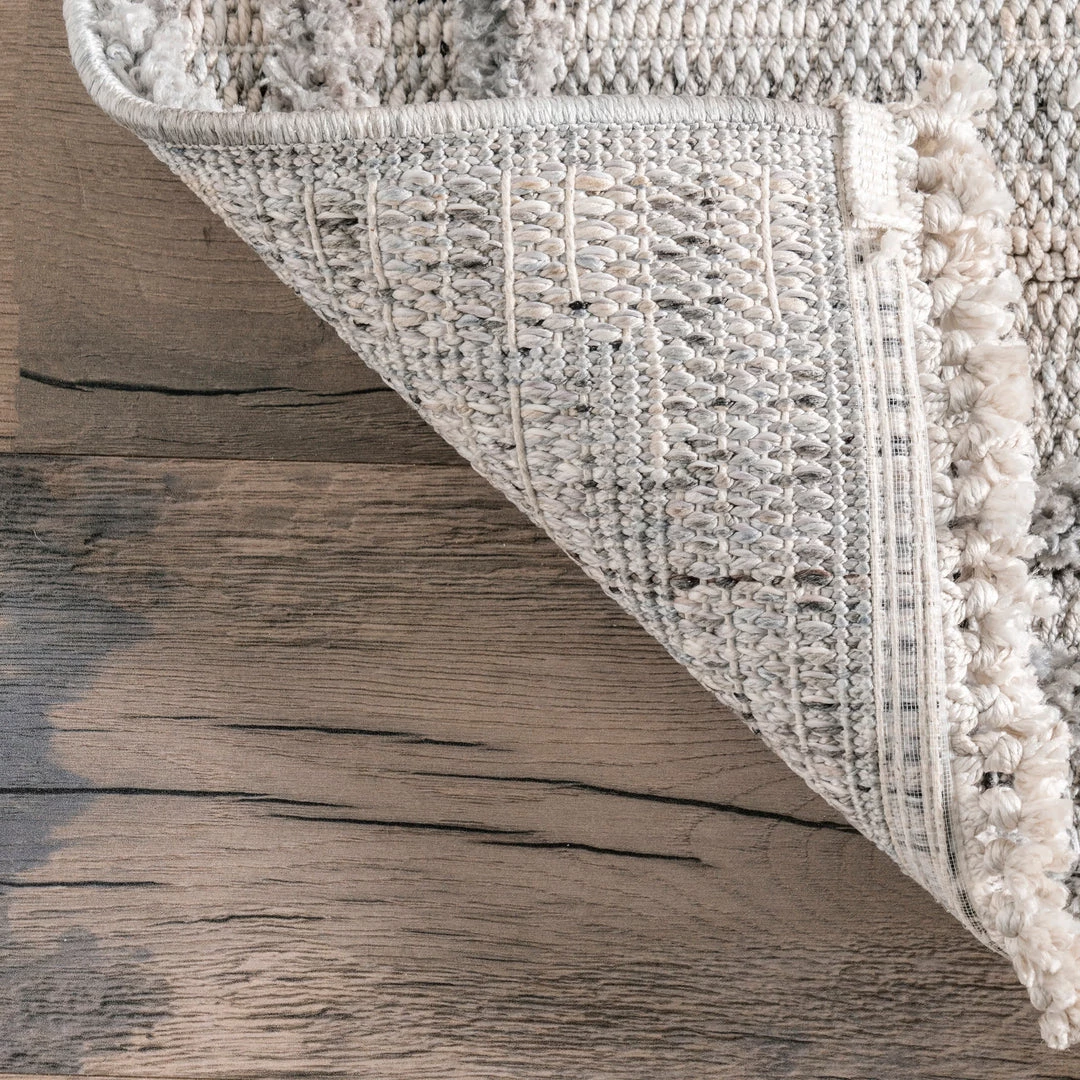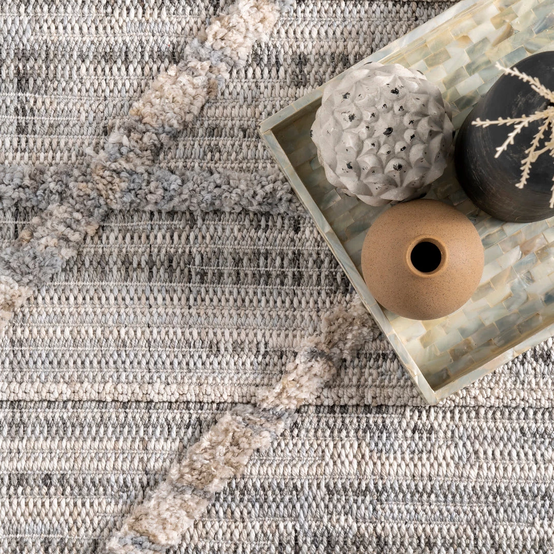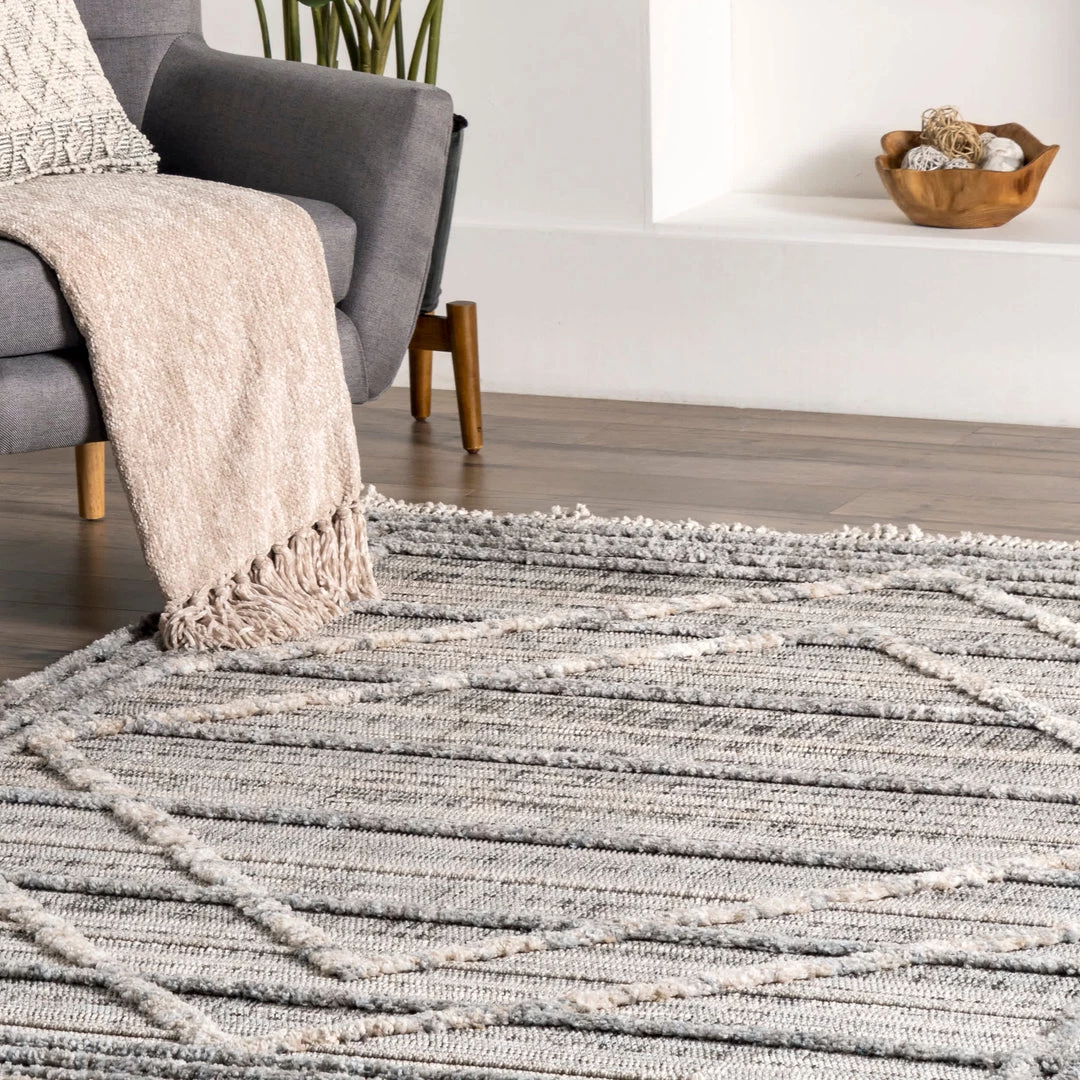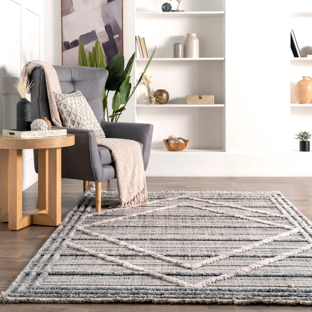 Elevate your living space with this geometric striped area rug. A beautifully textured design, raised diamond accents, and knotted tassels will complete any room in your home. This rug adds a bit of edge but also a sophisticated touch. Sit back and relax with our pet-friendly and easy to clean area rugs.