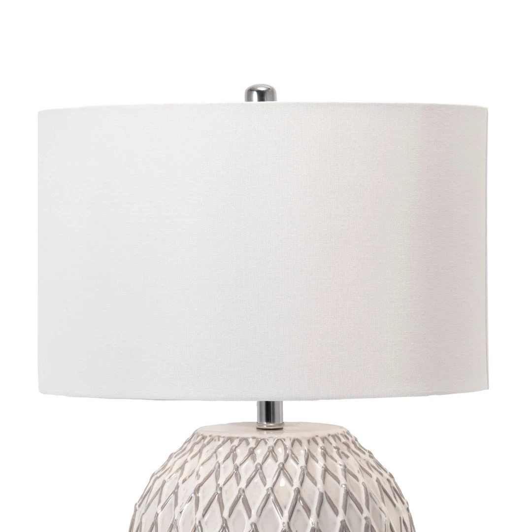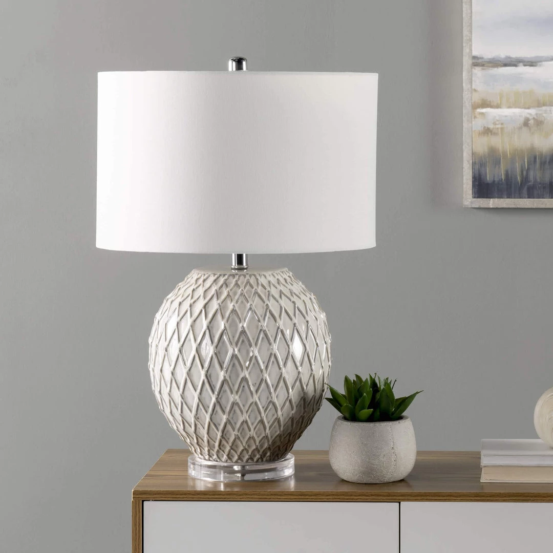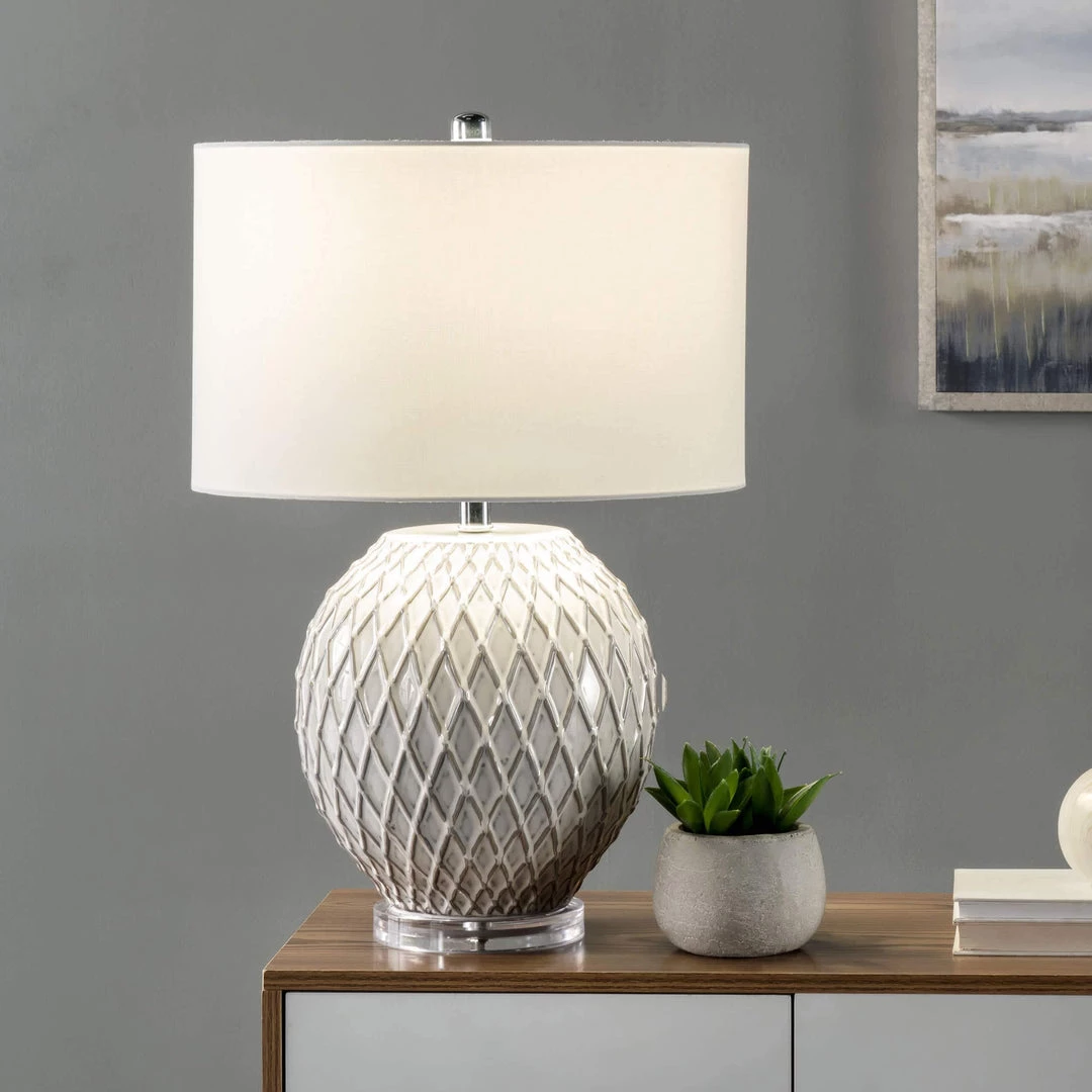 Finish off a side table with this striking traditional table lamp. The 26-inch high ceramic sphere base is easy to fit on your table, desk, or nightstand. A simple fabric drum shade pops on the top of this lamp effortlessly, creating a balanced look with soft lighting.