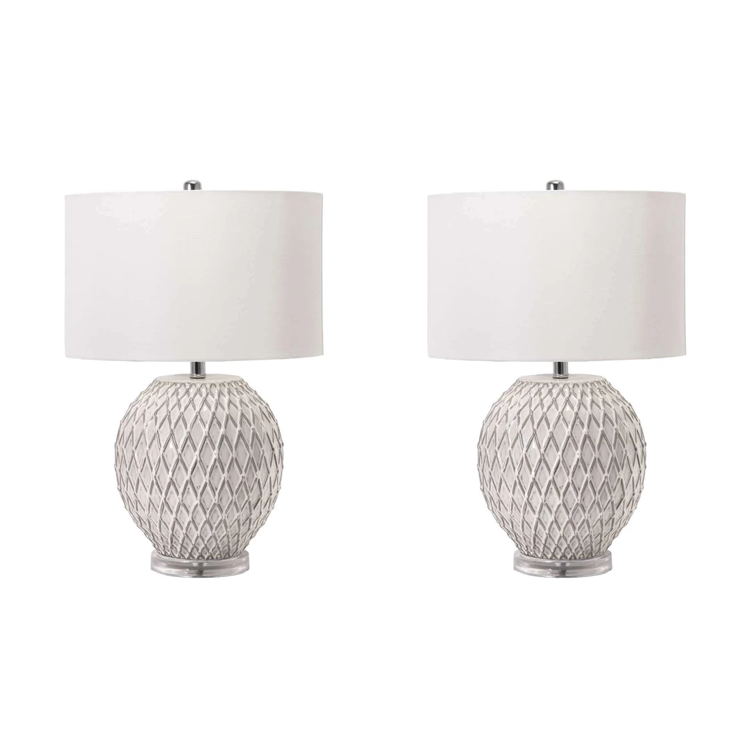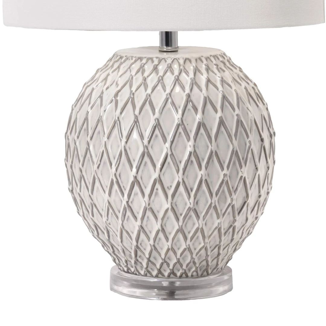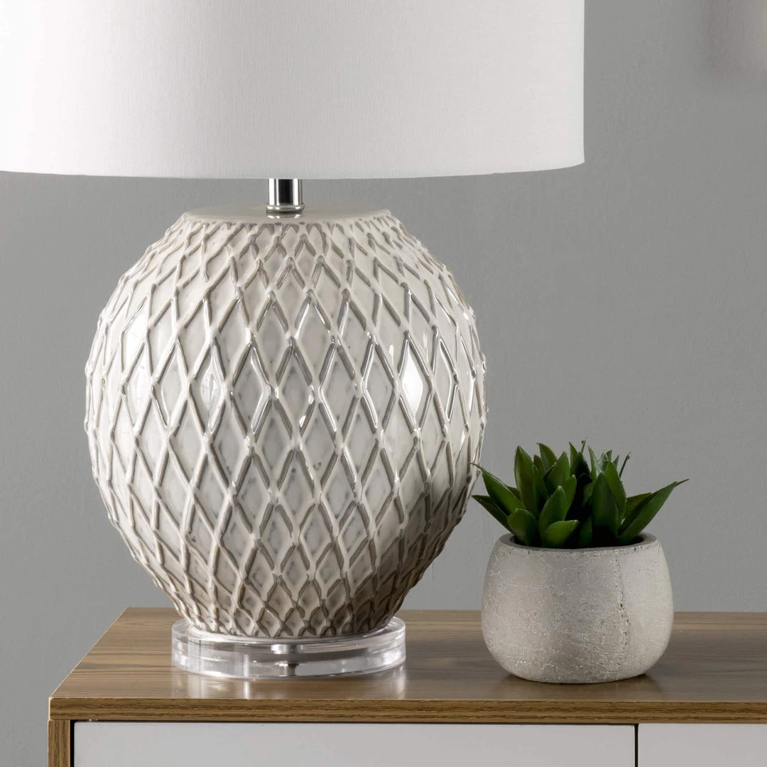 Finish off a side table with this striking traditional table lamp. The 26-inch high ceramic sphere base is easy to fit on your table, desk, or nightstand. A simple fabric drum shade pops on the top of this lamp effortlessly, creating a balanced look with soft lighting.