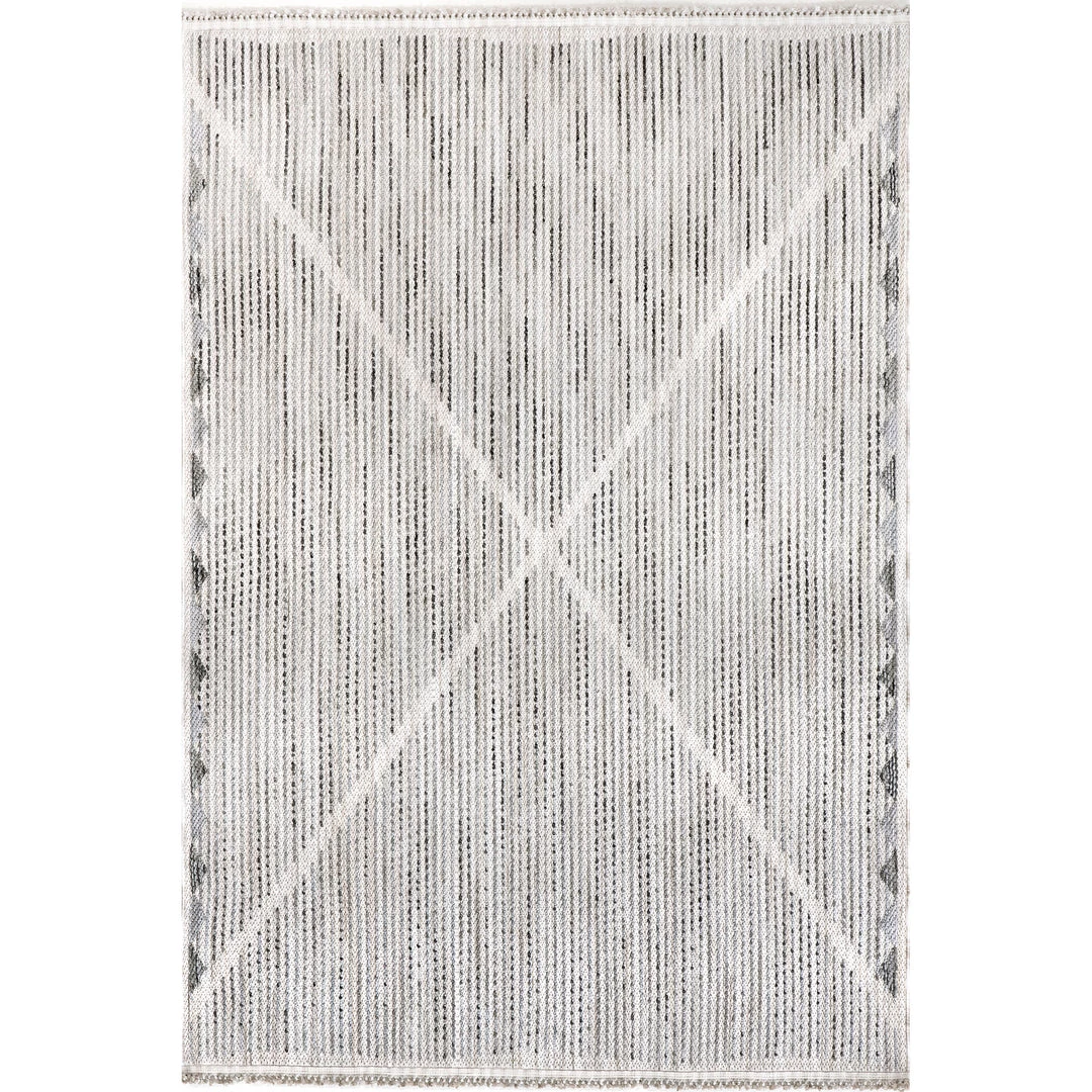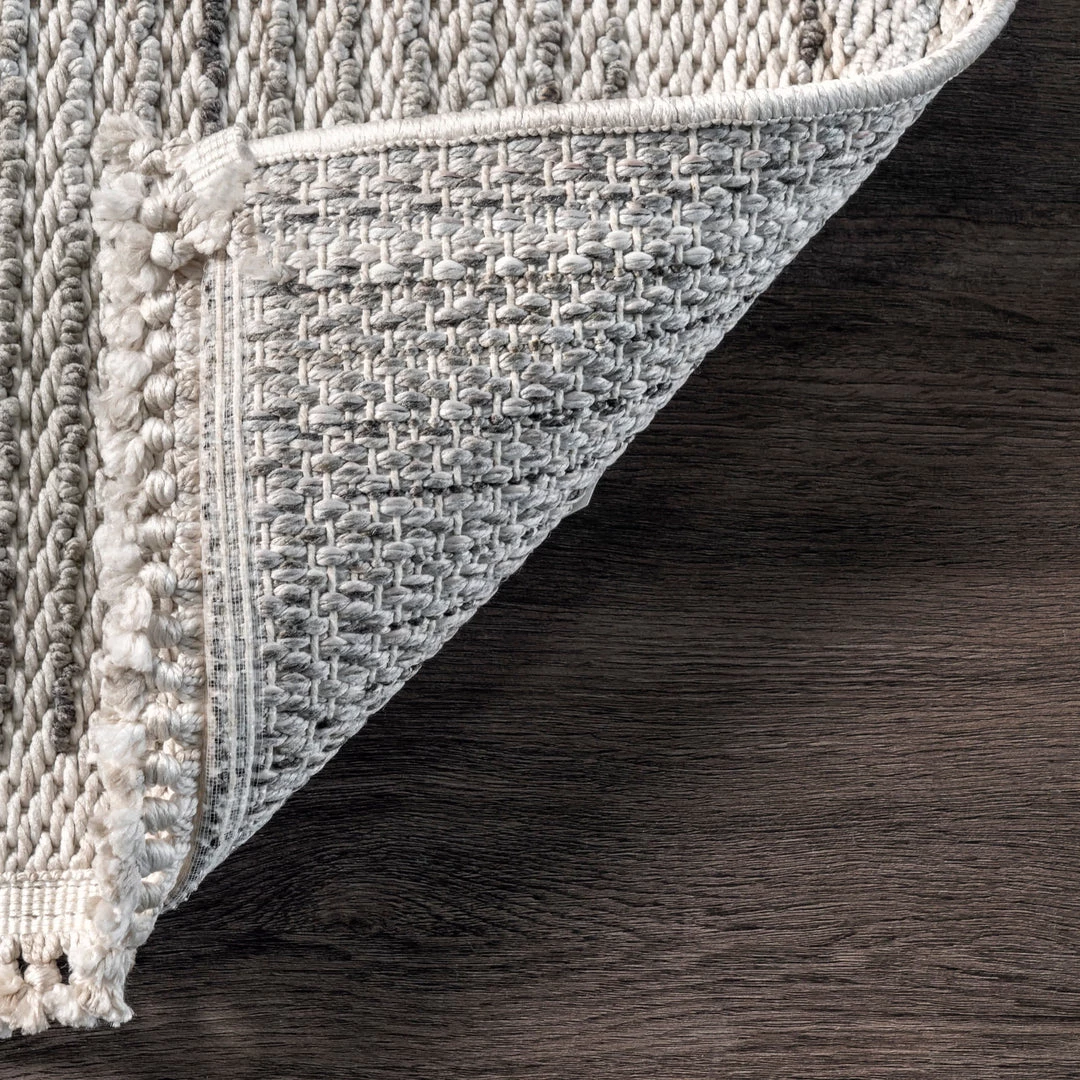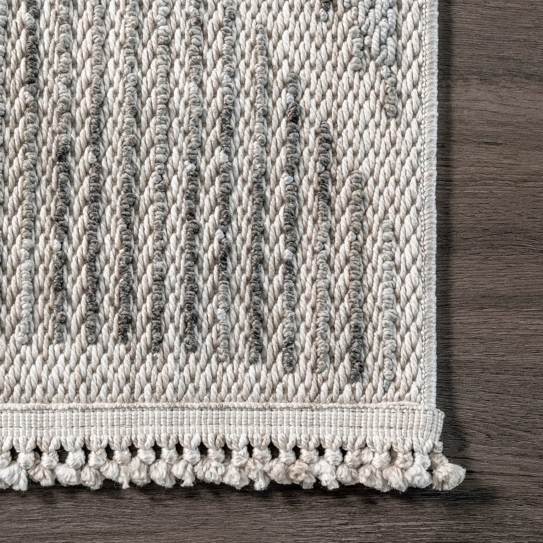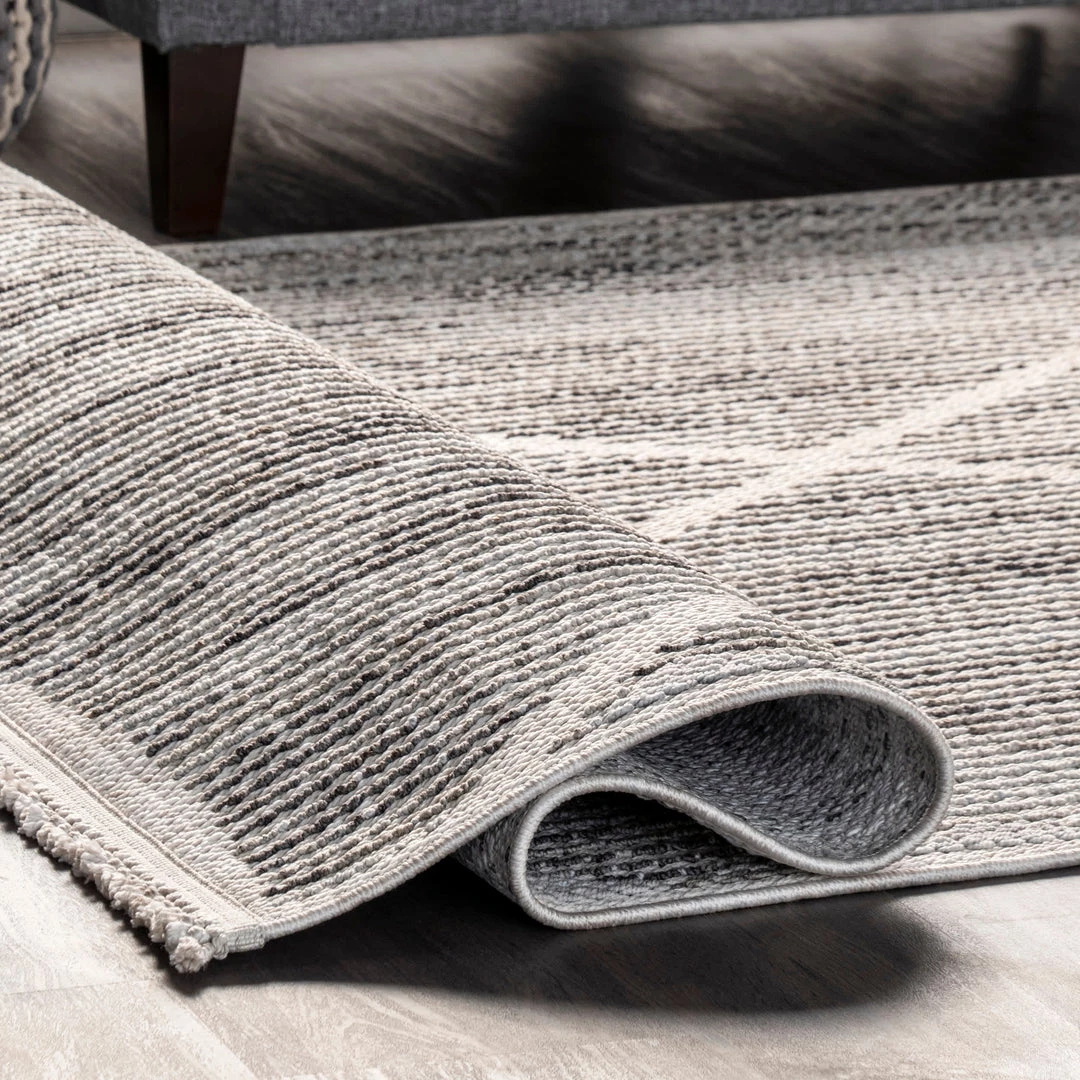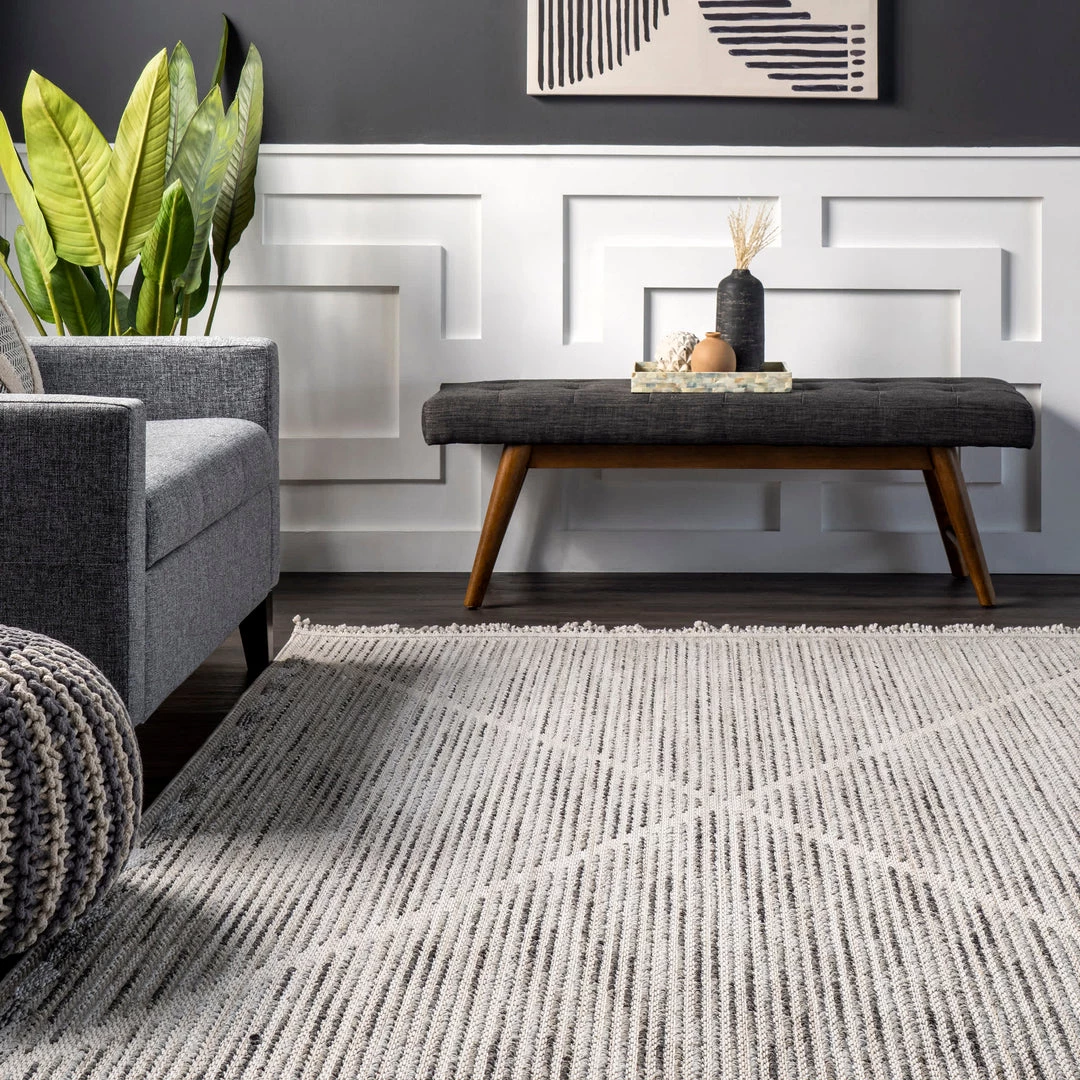 Give your space a cozy touch with this gorgeous triangular tasseled area rug. With calming hues, clean lines, and knotted tassels this rug will be the perfect addition to any room. Kick back and relax with our pet-friendly and easy to clean area rugs.