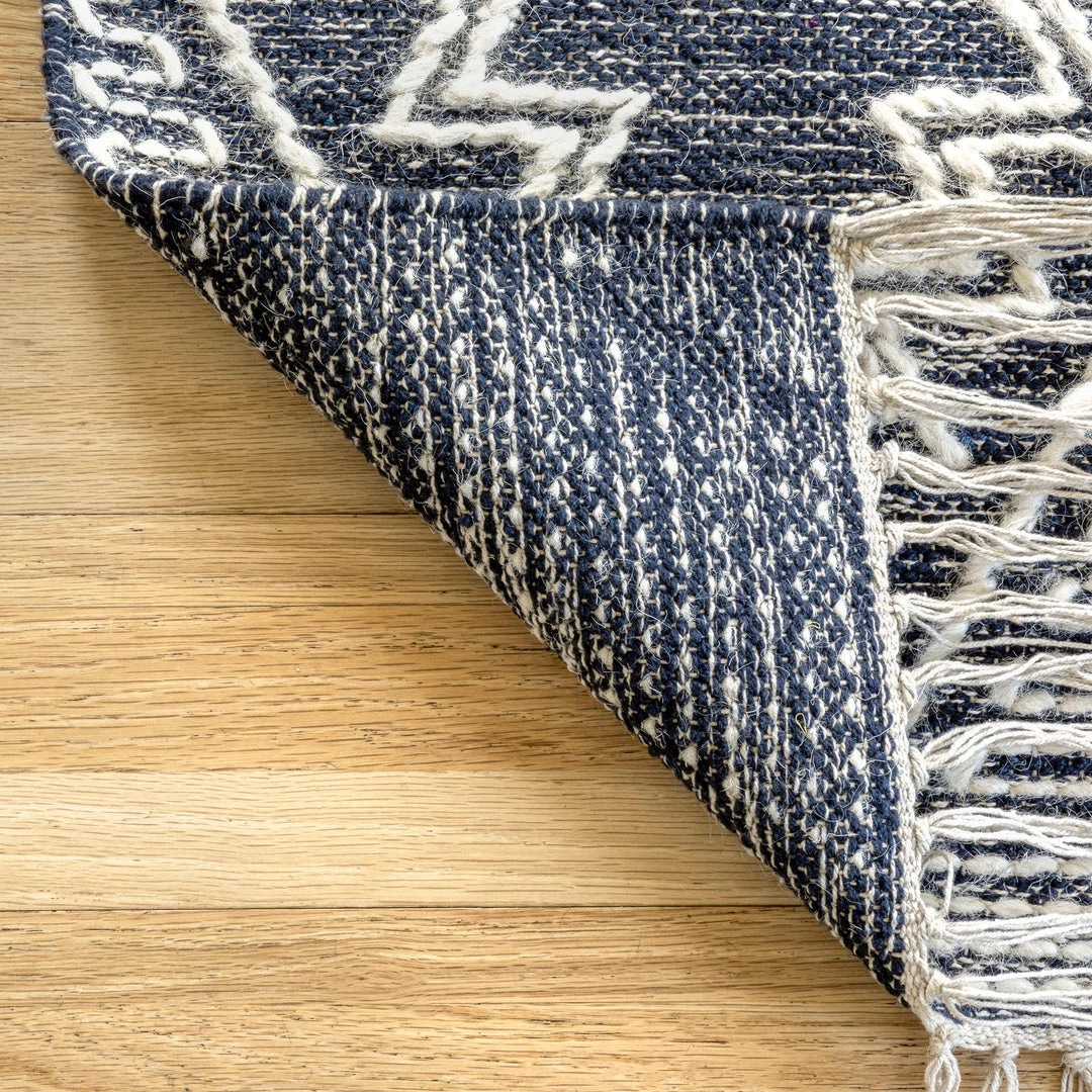 Enjoy this beautiful geometric pattern hand woven on this sleek flatweave area rug. This rug simply has it all- made from cotton and wool and completed with tassels on either end.