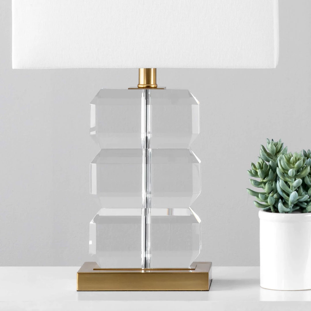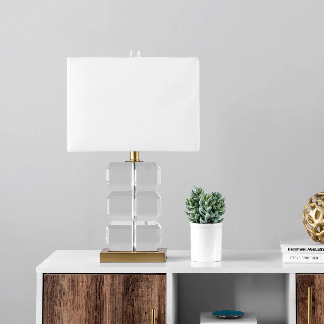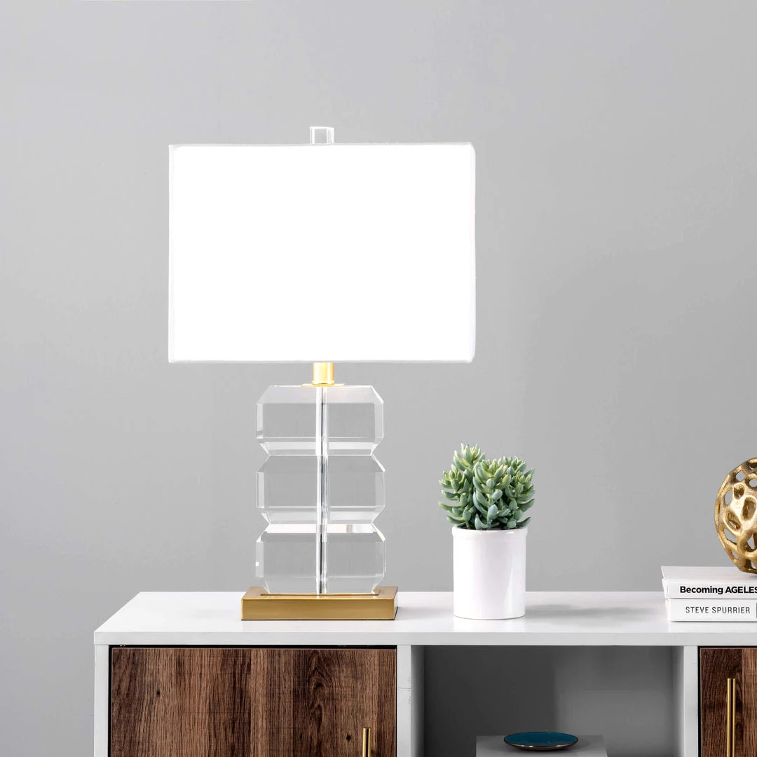Top off a side table with a decorative transitional style table lamp. A 24-inch tall stacked crystal base will fit easily onto your table, desk, or nightstand. A simple fabric rectangle shade pops on the top of this lamp easily, creating a balanced look with diffused light.