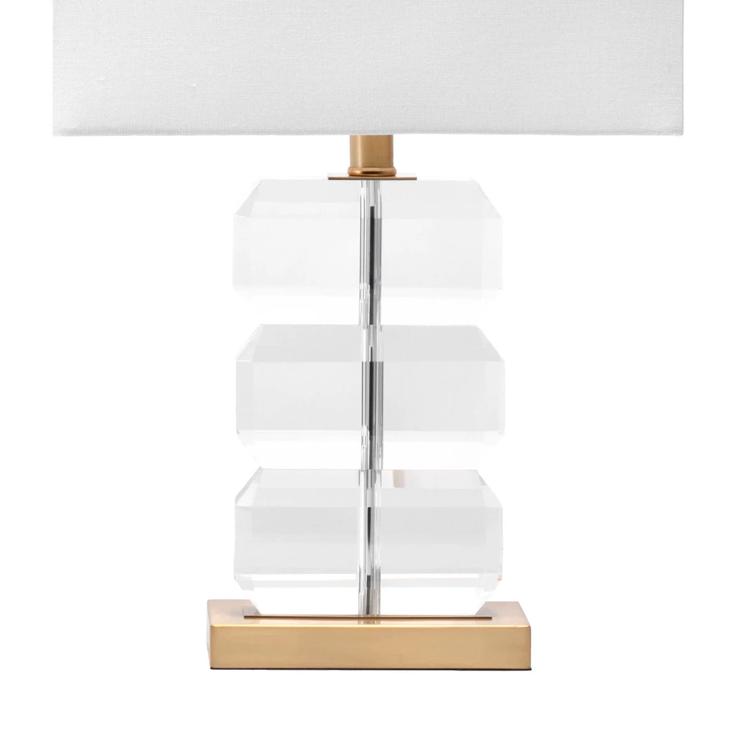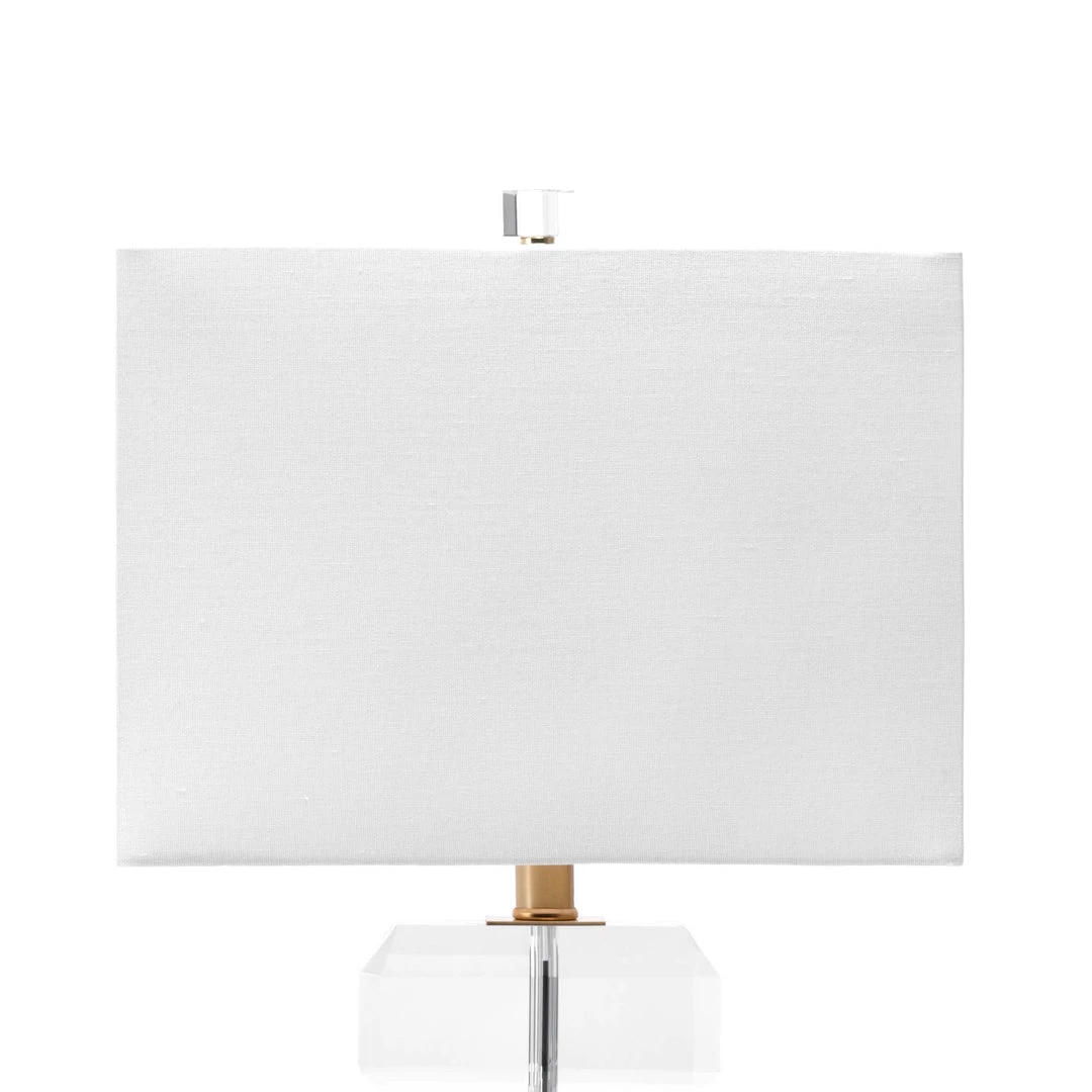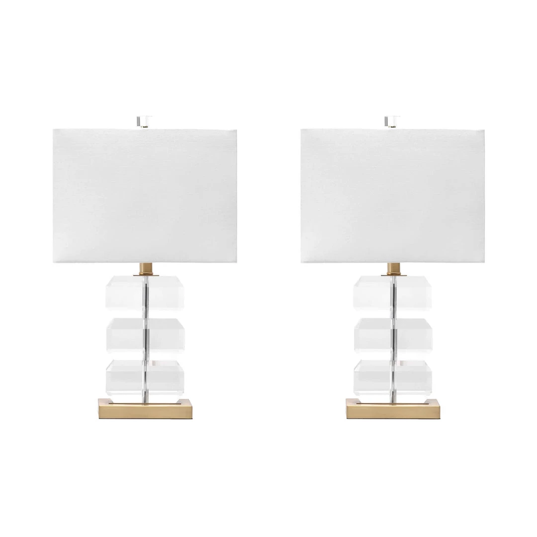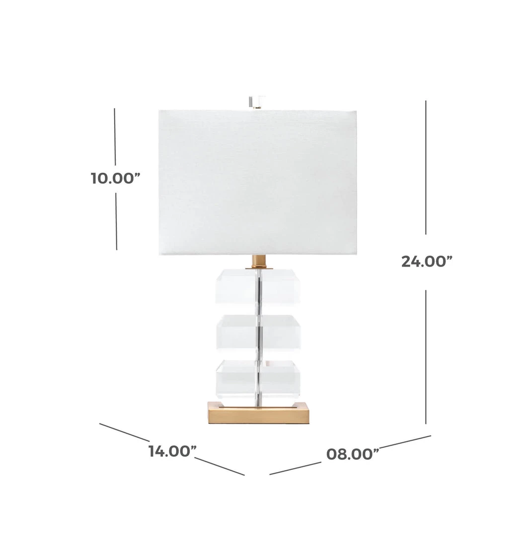 Top off a side table with a decorative transitional style table lamp. A 24-inch tall stacked crystal base will fit easily onto your table, desk, or nightstand. A simple fabric rectangle shade pops on the top of this lamp easily, creating a balanced look with diffused light.