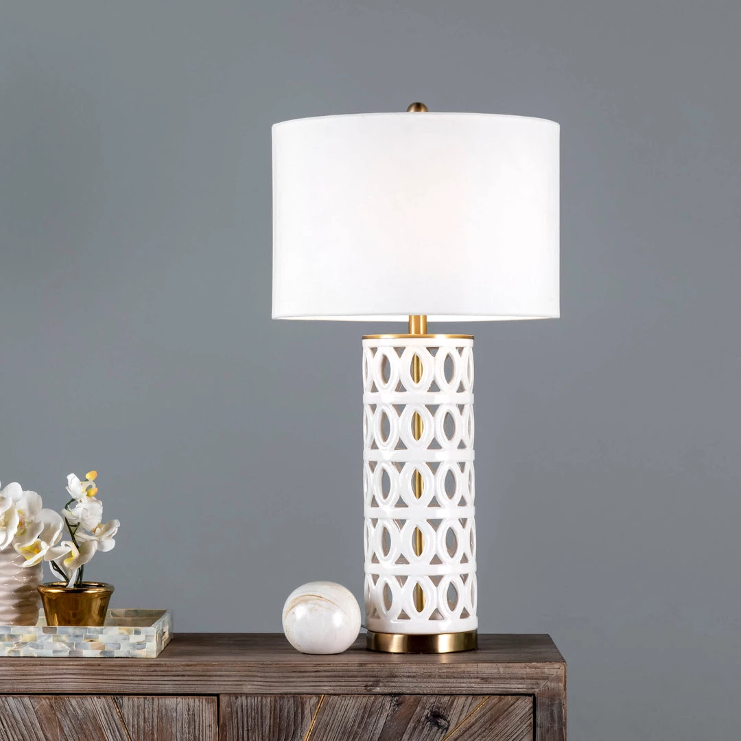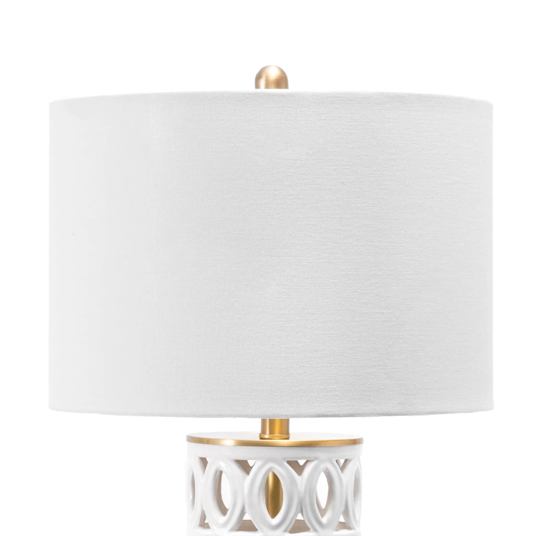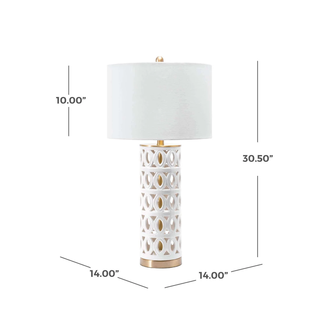 Let your room shine with the addition of this contemporary, 31-inch high, ceramic table lamp. It has a cloth shade that delivers ambient lighting and will add a vibrant flair to any room.