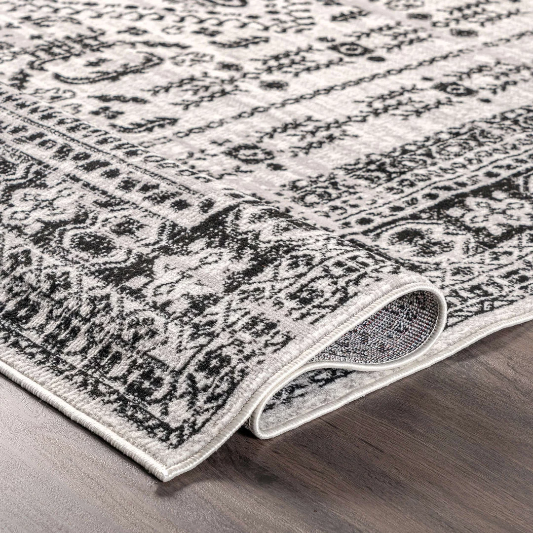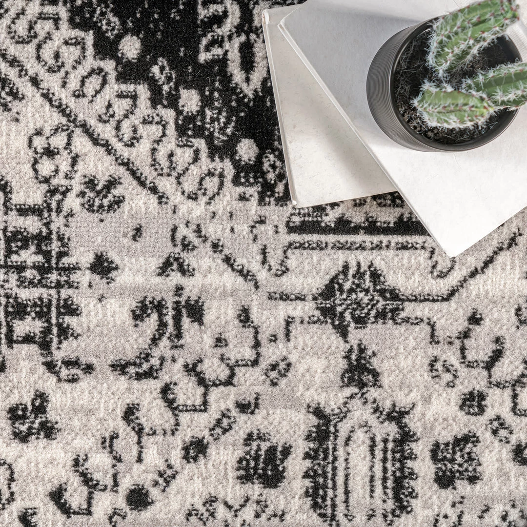 The distressed medallion pattern of this rug blends vintage style with traditional comfort. This monochrome color combination can add timeless charm to any space. Machine-made of polypropylene, a stain-resistant, and fade-resistant fiber, making it ideal for high-traffic areas in your home.