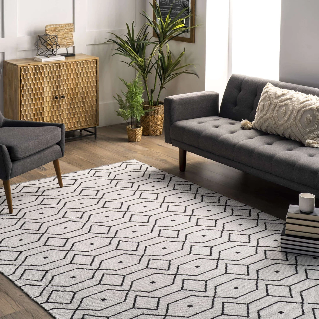 Add a bit of contemporary flair to your space with this fresh-feeling geometric rug. Sleek and versatile, this hand-loomed cotton rug is the perfect addition to your space.
