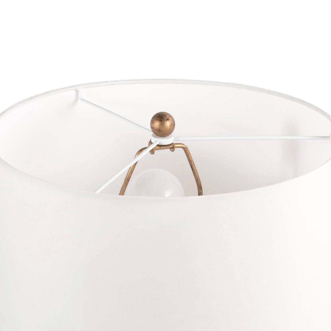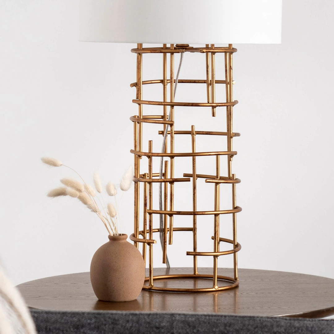 Make this contemporary gold-plated, 29-inch high table lamp a statement piece in any room. It has a 14-inch wide cotton, ivory, drum lamp shade that delivers ambient lighting. The base is a hollow, dystopic, conical lamp body with a solid pipe as its neck. Keeping in tune with its modern design, it has a clear lamp cord with an inline switch. To be used with a maximum 60-watt lightbulb. Light bulb not included.