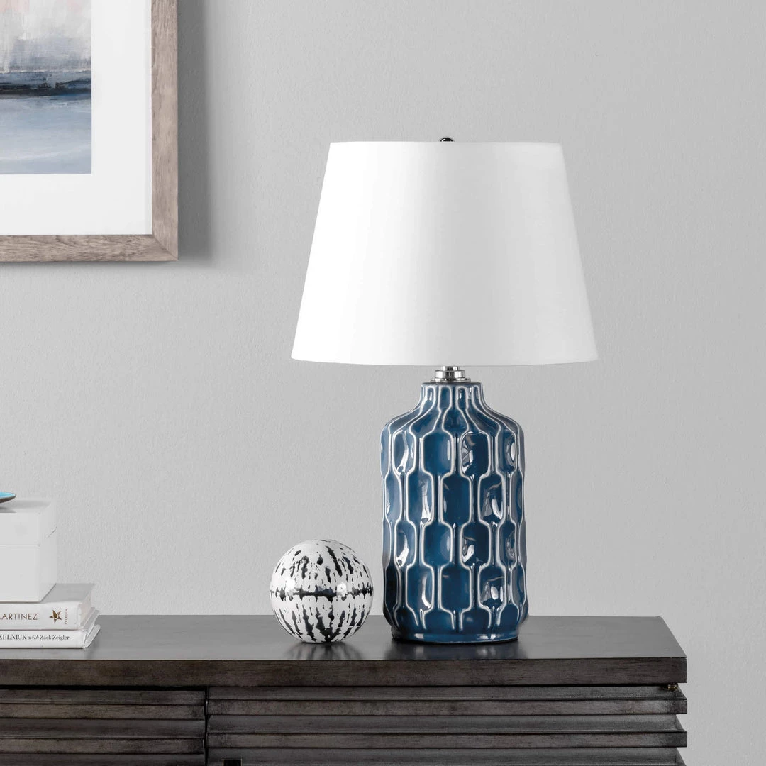 Place this versatile table lamp on a side table, end table, or desk to provide more light for reading or watching television. The ceramic cylinder base gives off a coastal look, while the classic fabric empire lampshade ensures ample lighting. The simple on-off switch allows for ease of use and functionality.