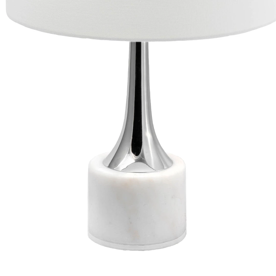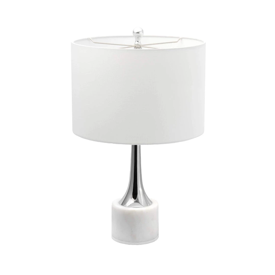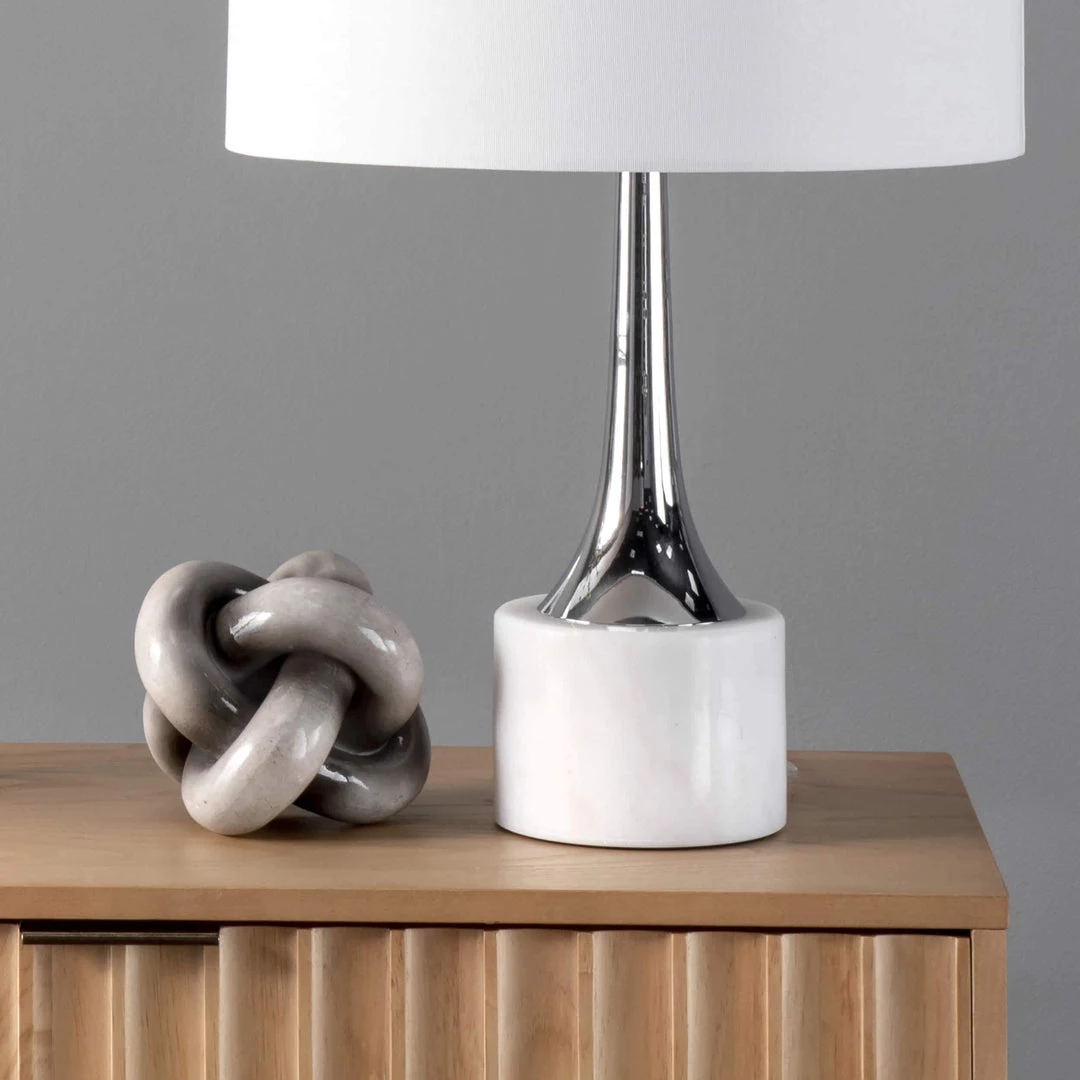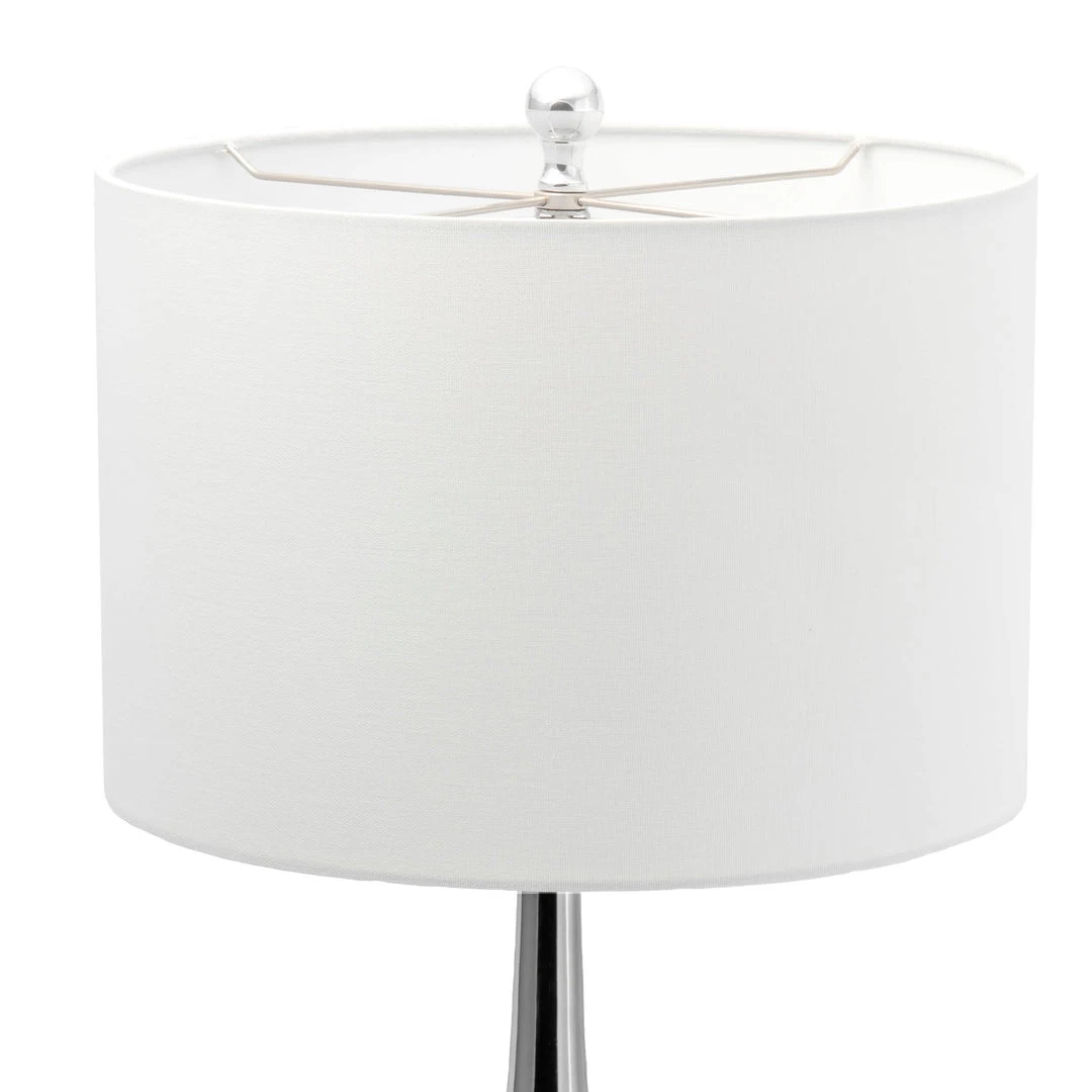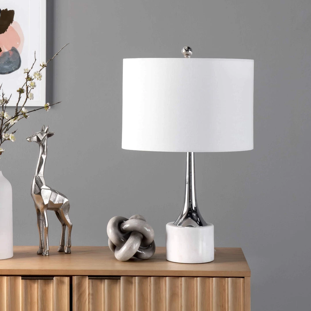 Enrich the look of any tabletop with this beautifully crafted contemporary table lamp. The 26-inch tall torch shaped base will fit easily onto your table, desk, or nightstand. A simple fabric drum shade pops on the top of this lamp easily, creating a balanced look with diffused light.