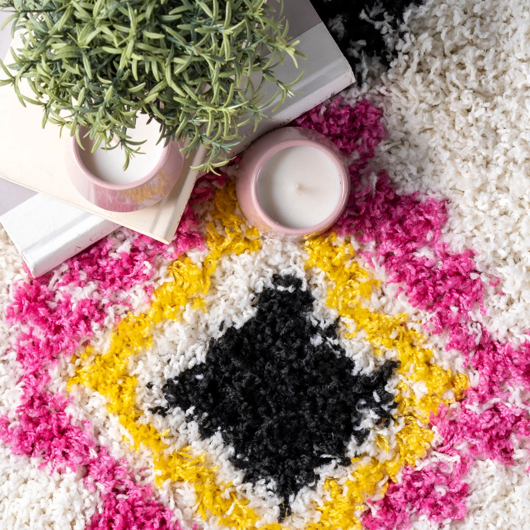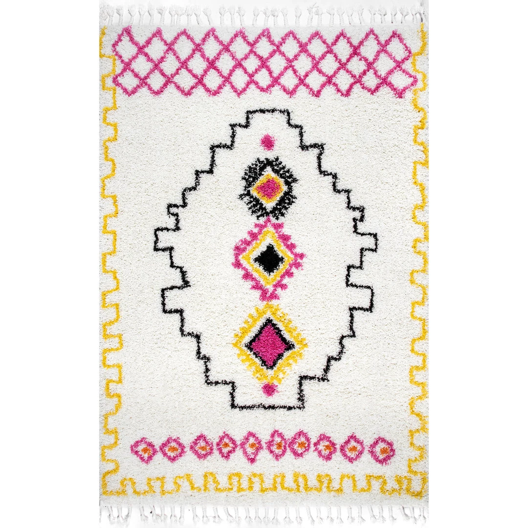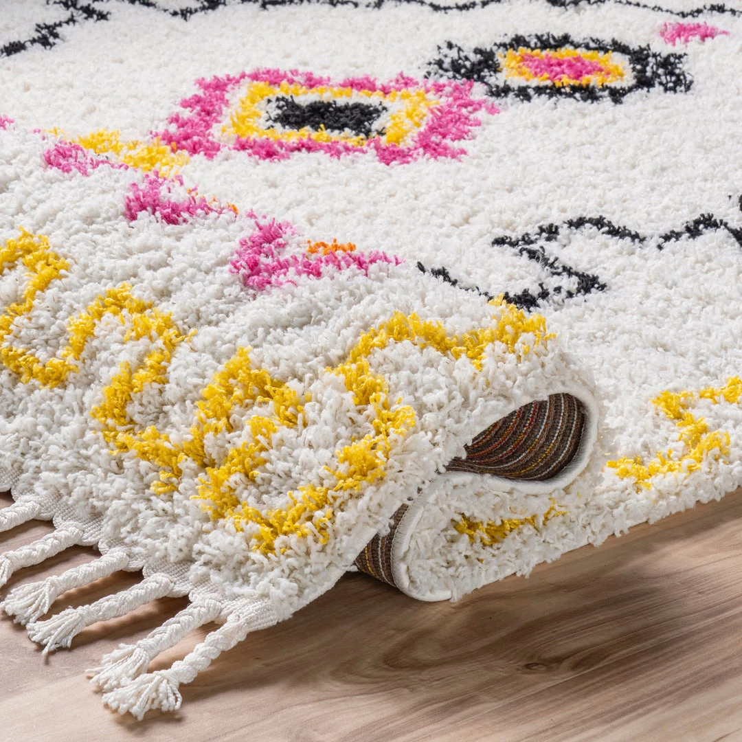This bright, beautiful, shaggy floor covering gives off the perfect amount of bohemian flair. This rug is machine-made from soft synthetic materials and is built to last.