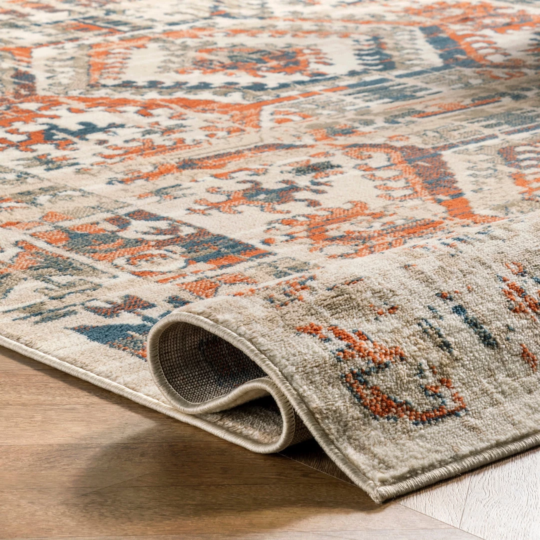 A beautiful earthy color palette and distressed design come together perfectly on this floor covering. Machine-made from silky soft synthetic material, this rug is perfect for you if spills and regular foot traffic are at the top of your mind