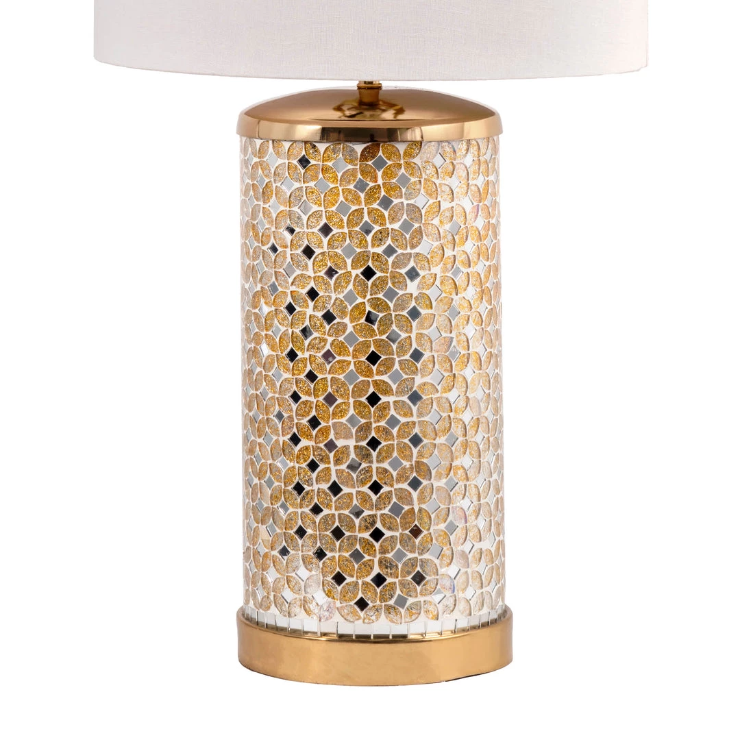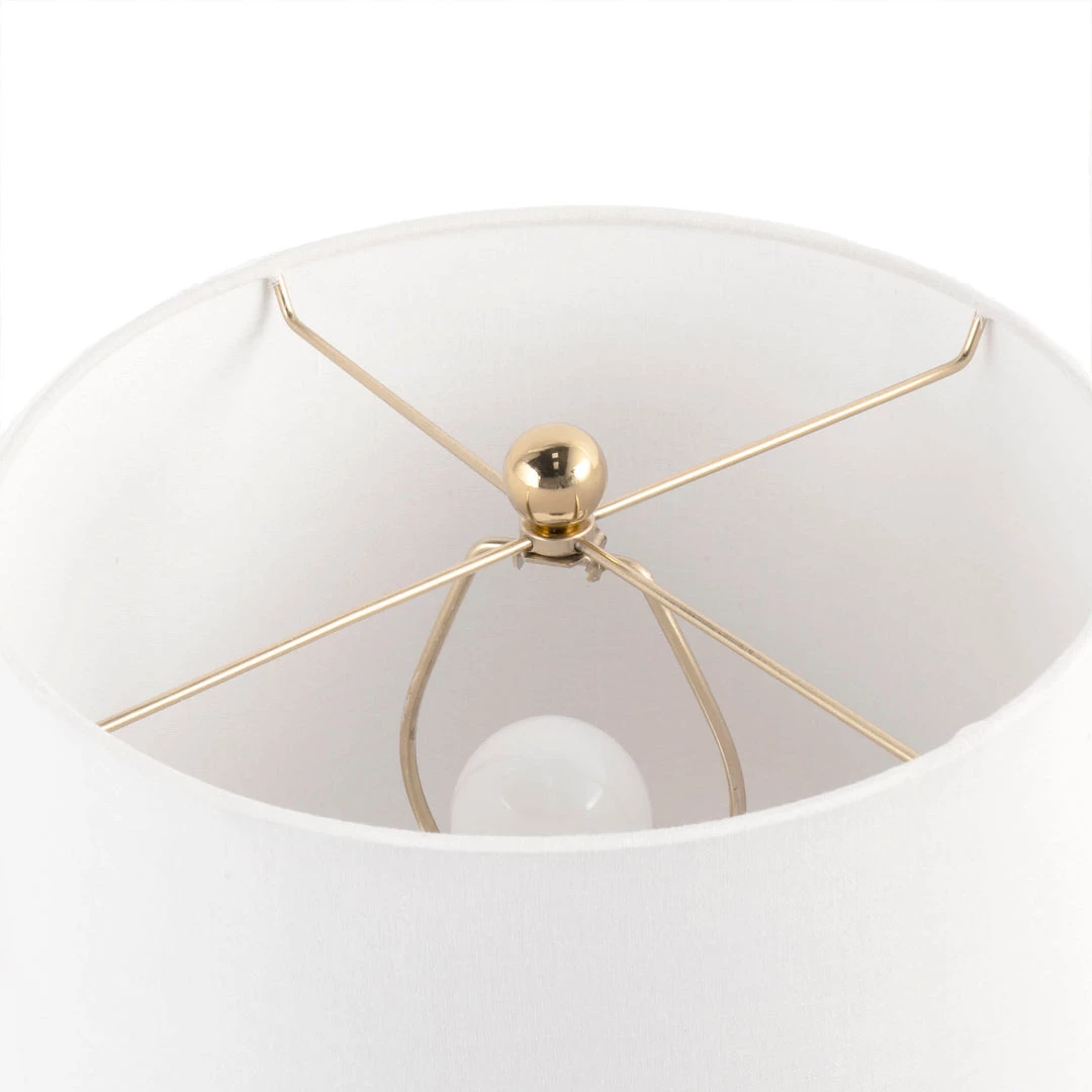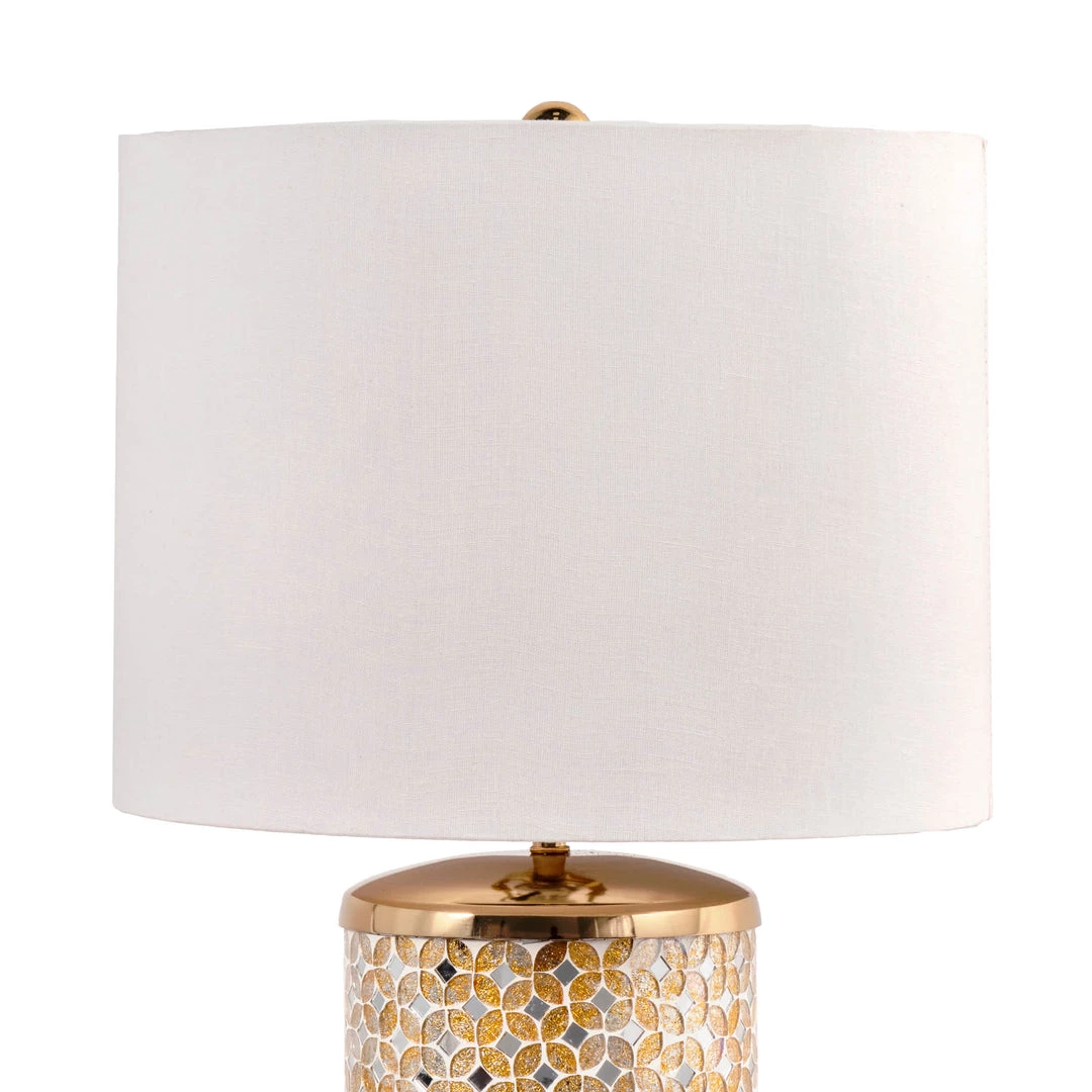 Let your room shine with the addition of this modern, 25-inch high, Glass & Iron table lamp. It has a Cotton shade that delivers bright ambient lighting. Add an vibrant flair to any room with its silver iron/glass finish.