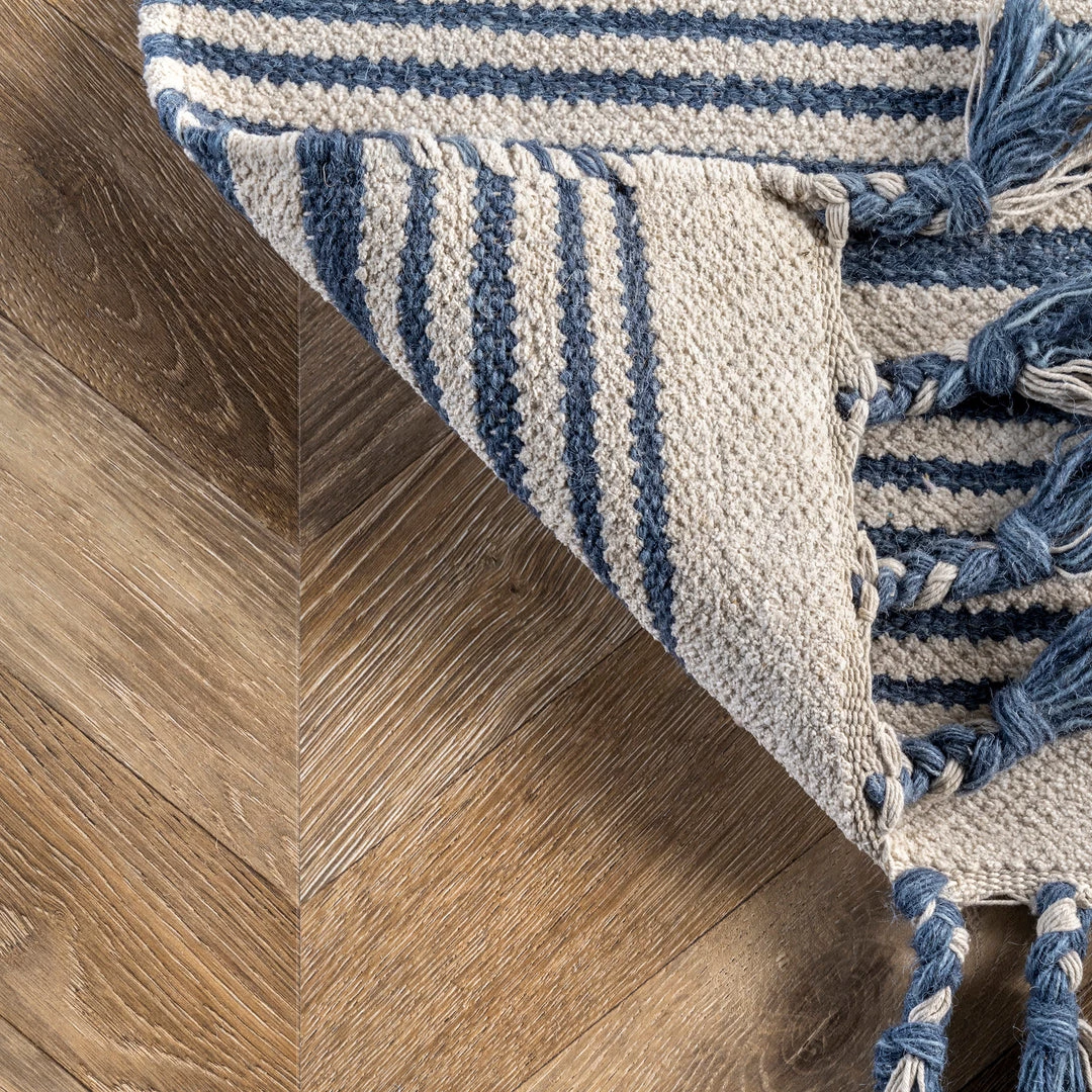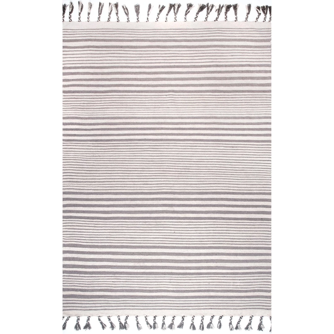 This casual striped rug with tassels is handmade from cotton and wool. It is sleek, simple, and refreshingly lightweight. Choose from either colorway for a more nautical or neutral look and feel.