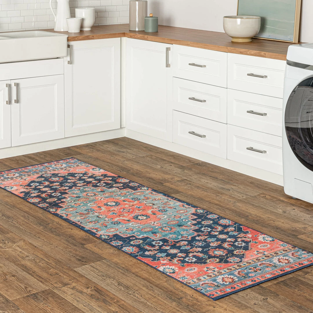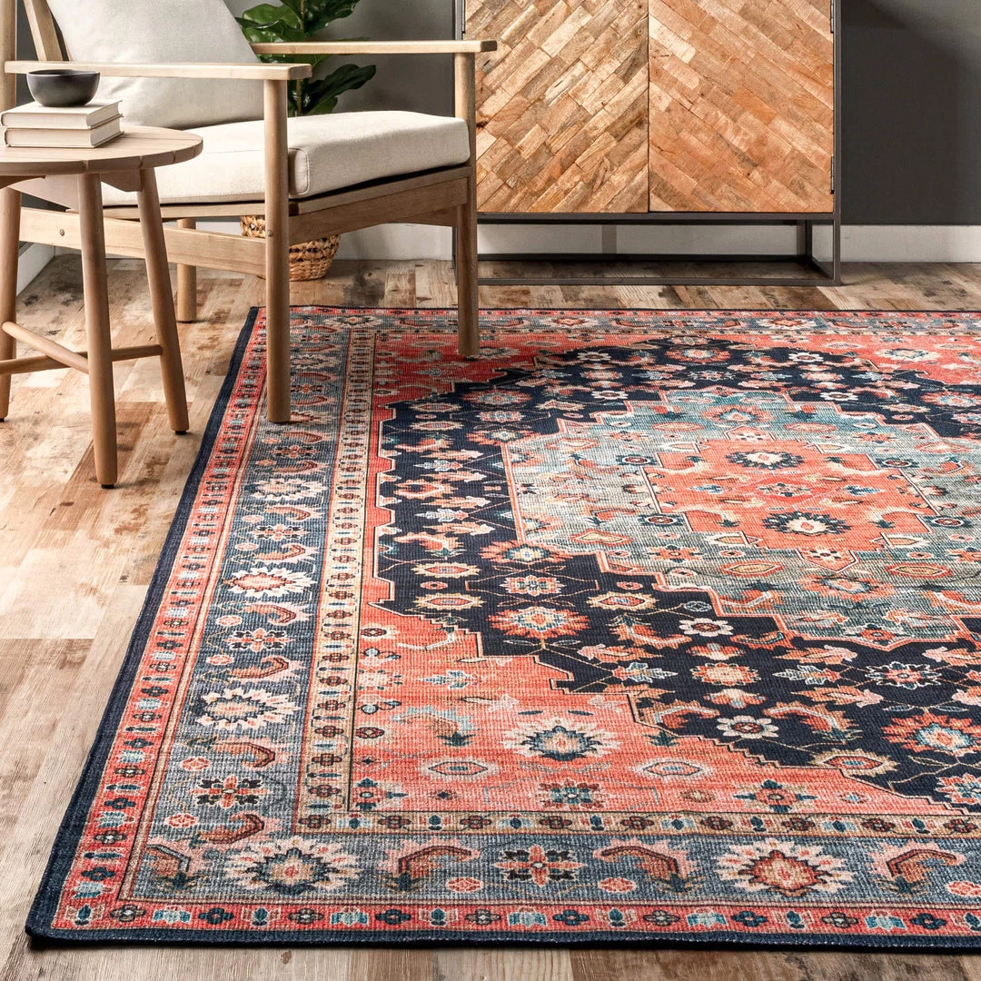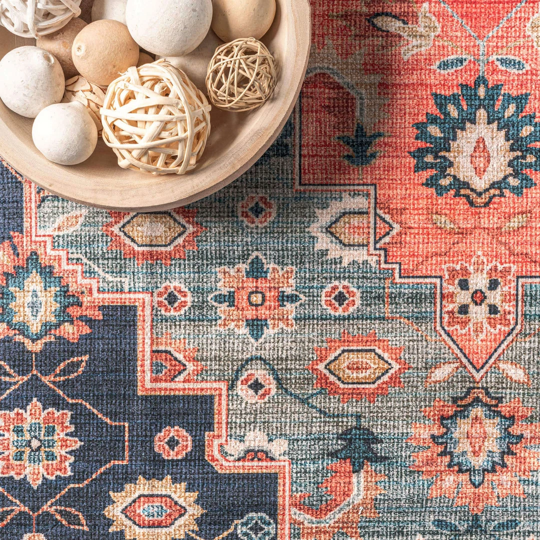 Add a pop of color to your space with our persian medallion machine washable area rug! Created from sustainably-sourced, premium recycled synthetic fibers, this washable area rug is made to withstand regular foot traffic. Our machine-washable collection is functional and stylish to keep up with your busy lifestyle. Simply roll your rug up, throw it in the washing machine, and you’re done! Enjoy every part of your home with our pet-friendly and easy to clean area rugs.
