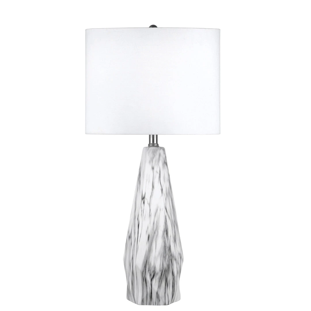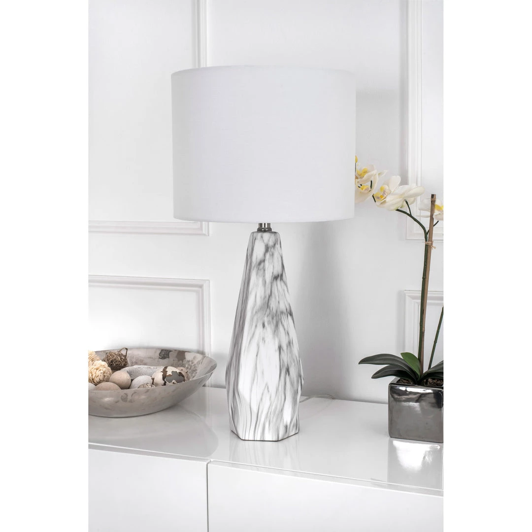 Broadcast clear illumination and elegant modern style with this table lamp. A swirled marble pattern adorns the durable ceramic base, which features unique shaping to draw attention, and a simple white drum shade caps this lamp with a neutral, balancing look while helping diffuse the light.