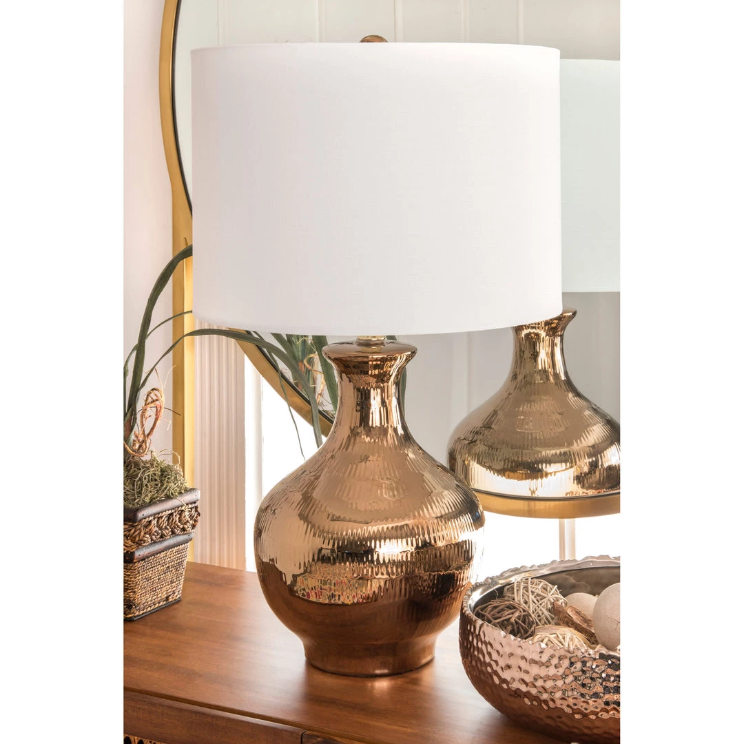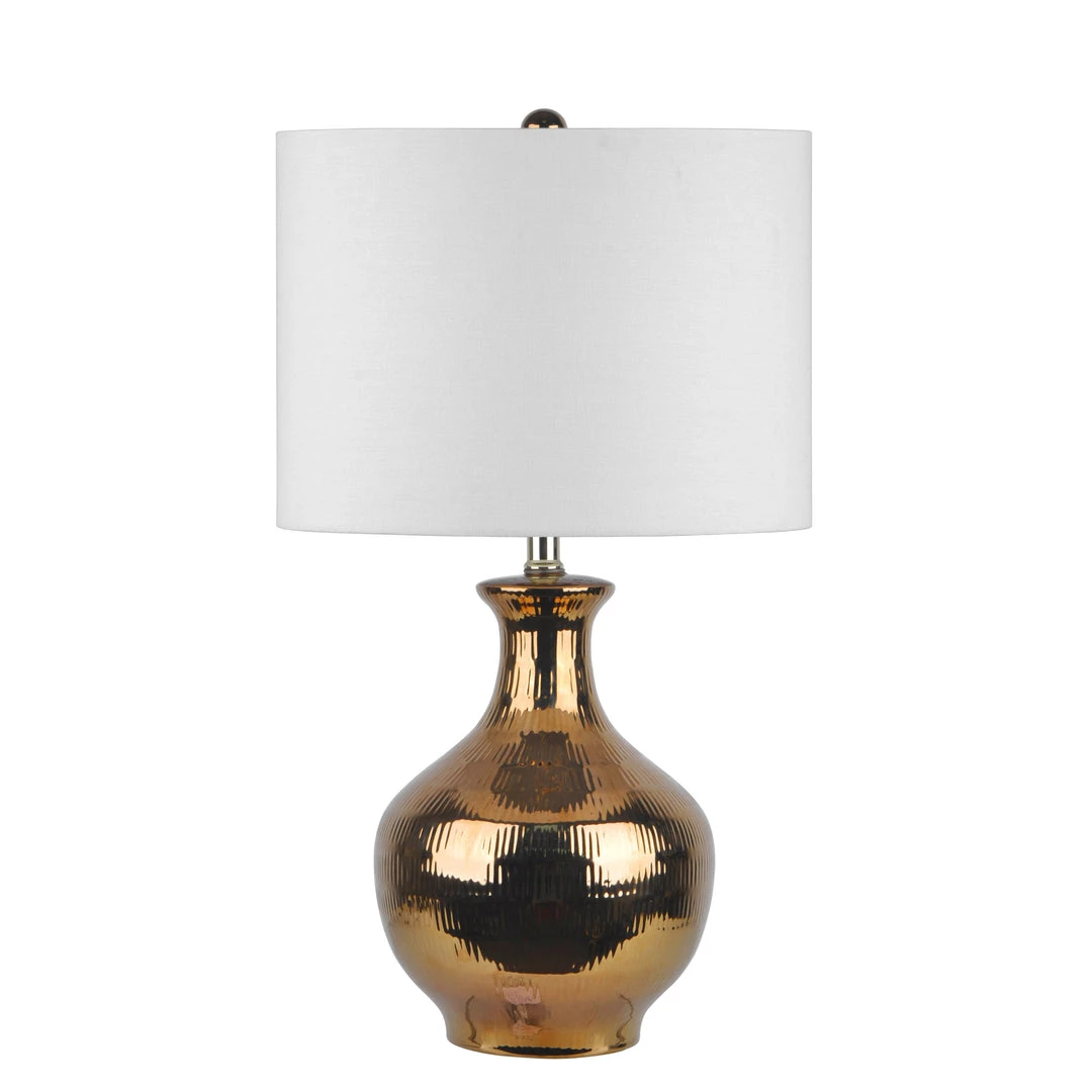 Sprinkle mid-century modern touches into your home starting with this table lamp. The vase-style base features a dramatically curving design with texturing and a goldtone finish to draw the eye. The stark white contrast of the linen shade accentuates this lamp’s beauty and dims the light to a warm glow for comfortable lighting.