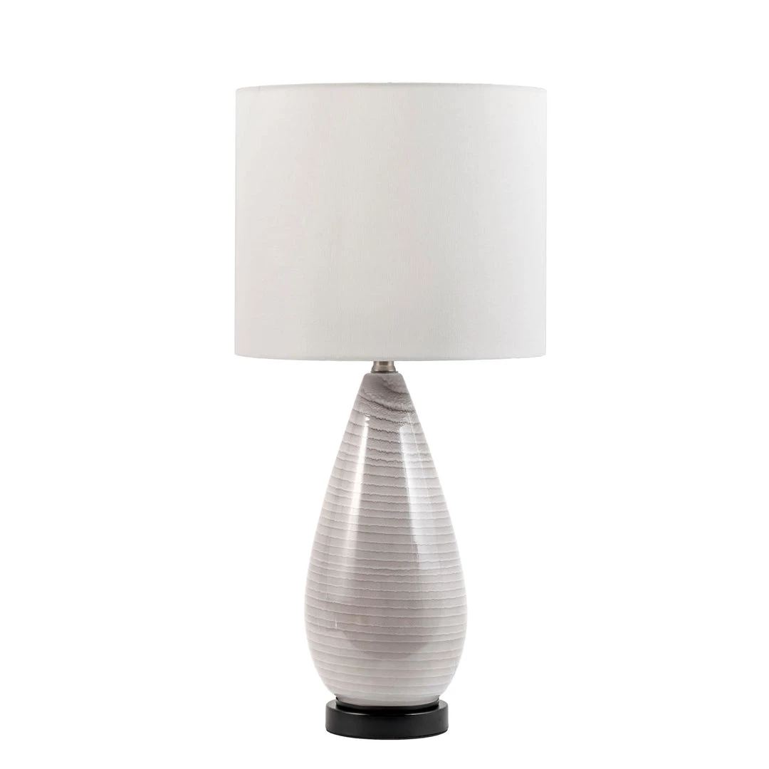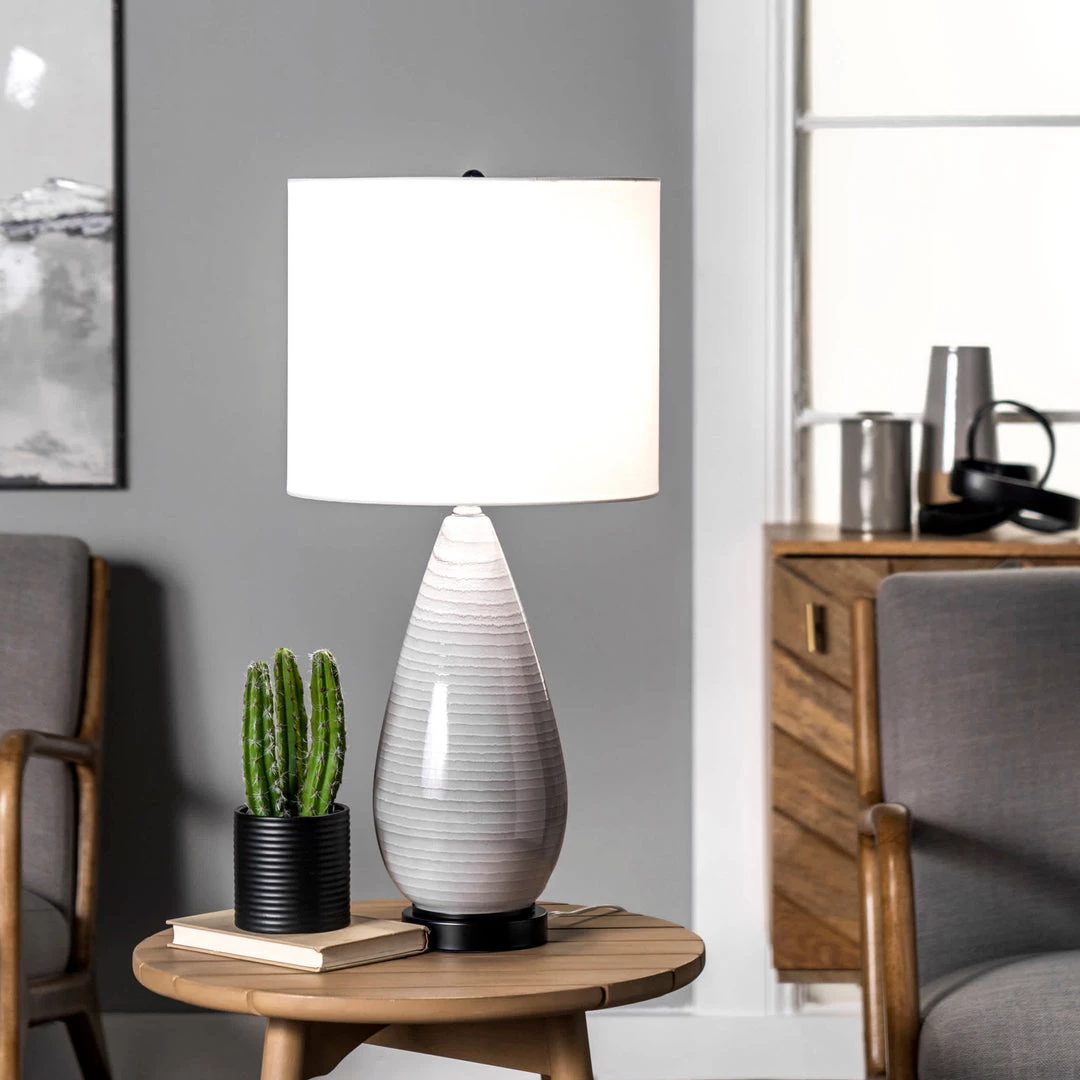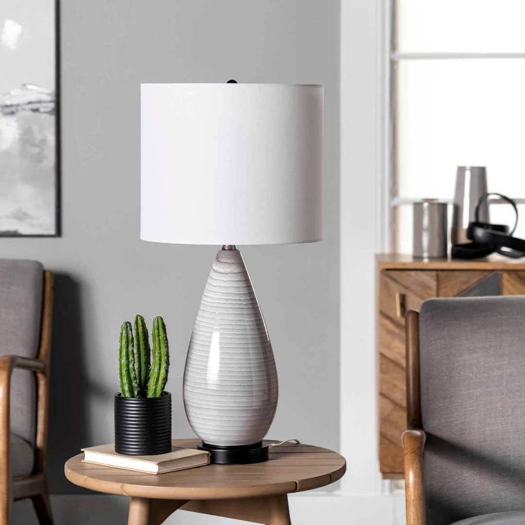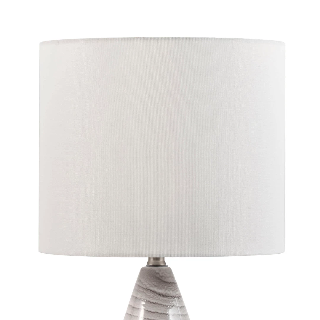 Let your room shine with the addition of this lavish 27-inch abstract table lamp. It has a Cotton Drum shade that delivers bright ambient lighting. Adds a vibrant flair to any room with its silver ceramic finish. It has a 13-inch wide, ivory cotton, drum lampshade that delivers soft lighting.