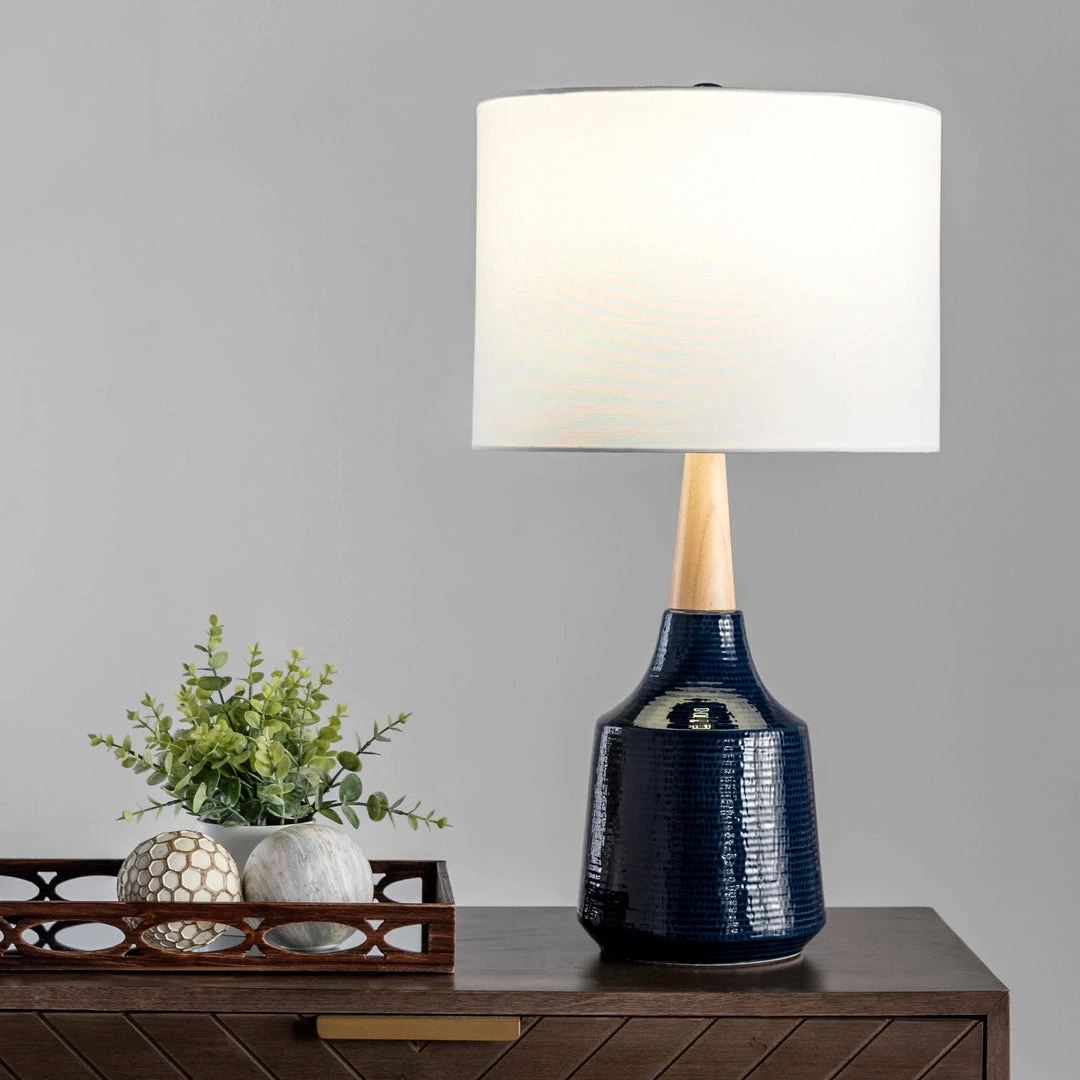Let your room shine with the addition of this lavish 28-inch abstract table lamp. It has a Linen Drum shade that delivers bright ambient lighting. Adds a vibrant flair to any room with its black ceramic & wood finish. It has a 15-inch wide, ivory linen, drum lampshade that delivers soft lighting.