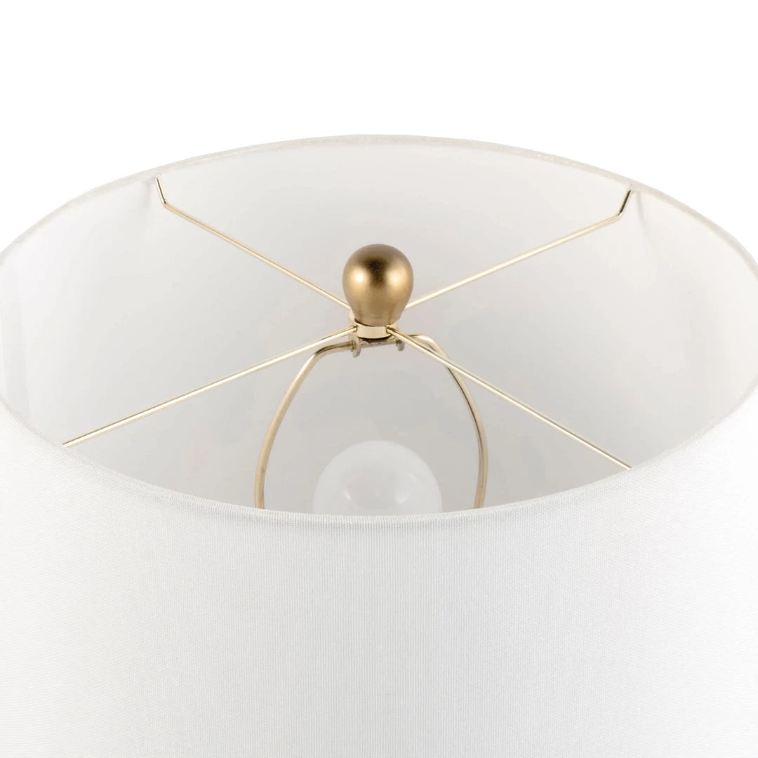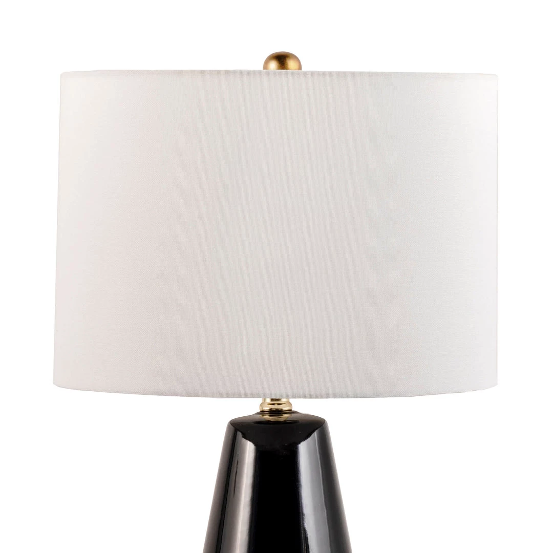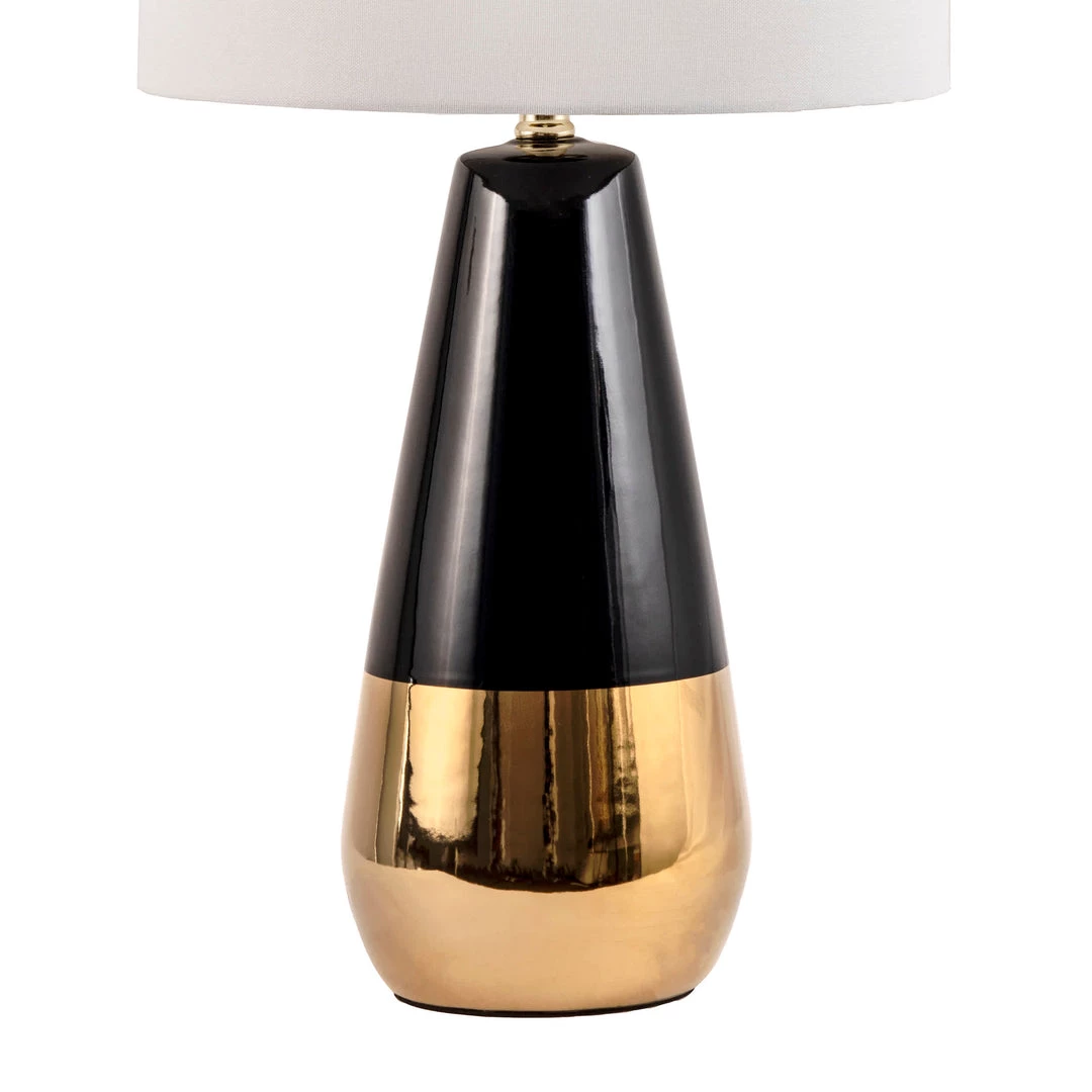 A 25-inch ceramic linen table lamp with a contemporary design. It has a 14-inch wide, ivory, cotton, drum lampshade that delivers soft lighting. The base is a golden and black vase with a stainless-steel pipe as its neck.