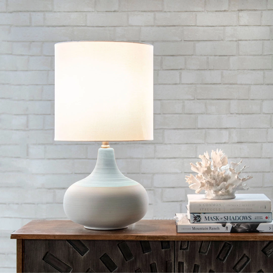 Combine modern and classic style on your table with this coastal white and blue ceramic table lamp by nuLOOM. Featuring a round, curved base with an elegant neck, this lamp adds a graceful touch to your existing decor. The white linen shade attaches quickly for easy assembly, and its delicate transparency provides either cool or warm light depending on bulb type. This lamp includes a user-friendly on and off switch and one Type A bulb to make setup a breeze.