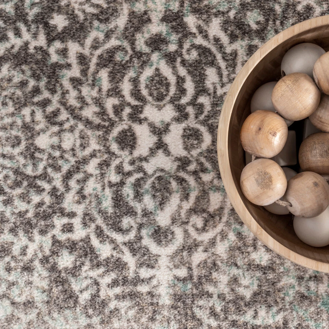 Lavishly designed with vivid floral scrollwork, this rug is machine made of 100% polyester for a luxurious feel underfoot. The distressed motif grounds your space in timeless splendor.